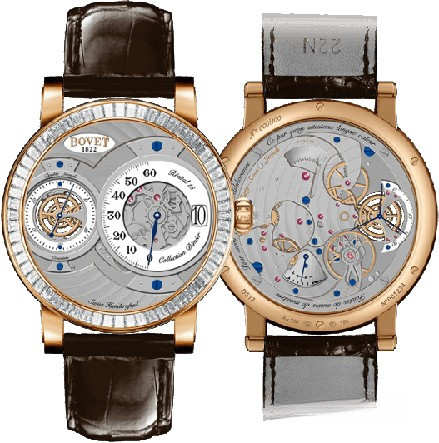 Мужские часы Bovet Dimier Recital 15 оснащены механизмом с ручным заводом, Калибр 13DM02-AIHSMR с запасом хода 5 дней. Диаметр корпуса 42 мм. Корпус часов изготовлен из 18-каратного розового золота. Циферблат белого цвета. Ремешок из кожи аллигатора, в комплекте — цепь из розового золота для ношения как карманные часы. Водонепроницаемы до 30 м. Функции: часы, минуты, секунды, индикатор запаса хода. Часы выпущены ограниченной серией 100 штук. Безель из 64-х белых багетных бриллиантов общим весом 3.25 ct.