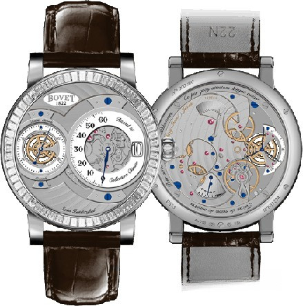 Мужские часы Bovet Dimier Recital 15 оснащены механизмом с ручным заводом, Калибр 13DM02-AIHSMR с запасом хода 5 дней. Диаметр корпуса 42 мм. Корпус часов изготовлен из 18-каратного белого золота. Циферблат белого цвета. Ремешок из кожи аллигатора, в комплекте — цепь из белого золота для ношения как карманные часы. Водонепроницаемы до 30 м. Функции: часы, минуты, секунды, индикатор запаса хода. Часы выпущены ограниченной серией 100 штук. Безель из 64-х белых багетных бриллиантов общим весом 3.25 ct.