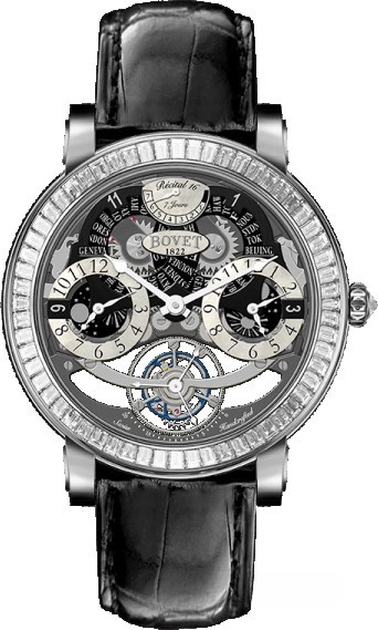 Часы Dimier Recital 16 выпускаются в корпусе из белого золота 18к размером 46 мм. Поставляются на ремешке из кожи аллигатора и соответствуют водонепроницаемости до 30 метров. Внутри корпуса находится механизм с ручным заводом 16DM01AI с балансовой частотой 21 600 пк/час, запасом хода 7 дней, 1-минутным турбийоном, а также функциями часов, минут и секунд. На черном с серебристым циферблате расположены индикаторы дня/ночи, второго часового пояса и запаса хода. Серия ограничена 20-ю экземплярами. Безель из 60-ти белых багетных бриллиантов общим весом 4.28 ct.