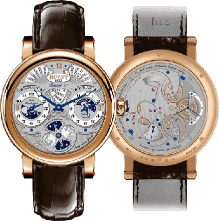 Collection Dimier Recital 17 - часы с трёх-часовым измерением времени, фазой луны. Корпус размером 45.3 х 15.6 мм выполнен из 18-каратного розового золото. Recital 17 оснащен дисплеем фазы Луны обеих полушарий. Циферблат лакированый белого цвета, частично скелетирован. Две центральные стрелки показывают местное время. По обе стороны отображаются два других часовых пояса (в горизонтальном положении между 9 и 3 часами), часы и минуты. Каждый из них сопровождается индикатором день/ночь и диском 24 городов. Дисплей фазы Луны принял положение на 6 часов, который одновременно указывает на рост Луны в северном и южном полушарии. Нуждается в коррекции один день каждые 128 лет. Сапфировое стекло с антибликовым покрытием защищает часы по обе стороны. Задняя сторона часов с открытым видом на механизм с индикатором запаса хода который отображает 7 дней резерв хода. А также секундный счетчик с тройной секундной стрелкой. Модель часов оснащена мануфактурным часовым механизмом с ручным подзаводом, Калибр 13DM033FPL. Частота колебания баланса 21600 п/ч. Укомплектованы элегантным ремешком из кожи аллигатора, с классической пряжкой из розового золота.