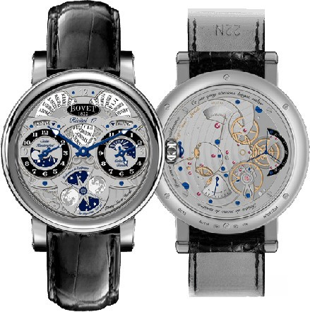 Collection Dimier Recital 17 - часы с трёх-часовым измерением времени, фазой луны. Корпус размером 45.3 х 15.6 мм выполнен из 18-каратного белого золото. Recital 17 оснащен дисплеем фазы Луны обеих полушарий. Циферблат черного цвета, частично скелетирован. Две центральные стрелки показывают местное время. По обе стороны отображаются два других часовых пояса (в горизонтальном положении между 9 и 3 часами), часы и минуты. Каждый из них сопровождается индикатором день/ночь и диском 24 городов. Дисплей фазы Луны принял положение на 6 часов, который одновременно указывает на рост Луны в северном и южном полушарии. Нуждается в коррекции один день каждые 128 лет. Сапфировое стекло с антибликовым покрытием защищает часы по обе стороны. Задняя сторона часов с открытым видом на механизм с индикатором запаса хода который отображает 7 дней резерв хода. А также секундный счетчик с тройной секундной стрелкой. Модель часов оснащена мануфактурным часовым механизмом с ручным подзаводом, Калибр 13DM033FPL. Частота колебания баланса 21600 п/ч. Укомплектованы элегантным ремешком из кожи аллигатора, с классической пряжкой из белого золота.