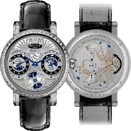 Collection Dimier Recital 17 - часы с трёх-часовым измерением времени, фазой луны. Корпус размером 45.3 х 15.6 мм выполнен из 18-каратного белого золото. Recital 17 оснащен дисплеем фазы Луны обеих полушарий. Циферблат черного цвета, частично скелетирован. Две центральные стрелки показывают местное время. По обе стороны отображаются два других часовых пояса (в горизонтальном положении между 9 и 3 часами), часы и минуты. Каждый из них сопровождается индикатором день/ночь и диском 24 городов. Дисплей фазы Луны принял положение на 6 часов, который одновременно указывает на рост Луны в северном и южном полушарии. Нуждается в коррекции один день каждые 128 лет. Сапфировое стекло с антибликовым покрытием защищает часы по обе стороны. Задняя сторона часов с открытым видом на механизм с индикатором запаса хода который отображает 7 дней резерв хода. А также секундный счетчик с тройной секундной стрелкой. Модель часов оснащена мануфактурным часовым механизмом с ручным подзаводом, Калибр 13DM033FPL. Частота колебания баланса 21600 п/ч. Укомплектованы элегантным ремешком из кожи аллигатора, с классической пряжкой из белого золота. Корпус инкрустирован 74-мя белыми багетными бриллиантами общим весом 6.36 ct.