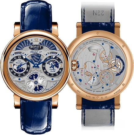 Collection Dimier Recital 17 - часы с трёх-часовым измерением времени, фазой луны. Корпус размером 45.3 х 15.6 мм выполнен из 18-каратного розового золото. Recital 17 оснащен дисплеем фазы Луны обеих полушарий. Циферблат из синего авантюрина, частично скелетирован. Две центральные стрелки показывают местное время. По обе стороны отображаются два других часовых пояса (в горизонтальном положении между 9 и 3 часами), часы и минуты. Каждый из них сопровождается индикатором день/ночь и диском 24 городов. Дисплей фазы Луны принял положение на 6 часов, который одновременно указывает на рост Луны в северном и южном полушарии. Нуждается в коррекции один день каждые 128 лет. Сапфировое стекло с антибликовым покрытием защищает часы по обе стороны. Задняя сторона часов с открытым видом на механизм с индикатором запаса хода который отображает 7 дней резерв хода. А также секундный счетчик с тройной секундной стрелкой. Модель часов оснащена мануфактурным часовым механизмом с ручным подзаводом, Калибр 13DM033FPL. Частота колебания баланса 21600 п/ч. Укомплектованы элегантным ремешком из кожи аллигатора, с классической пряжкой из розового золота.