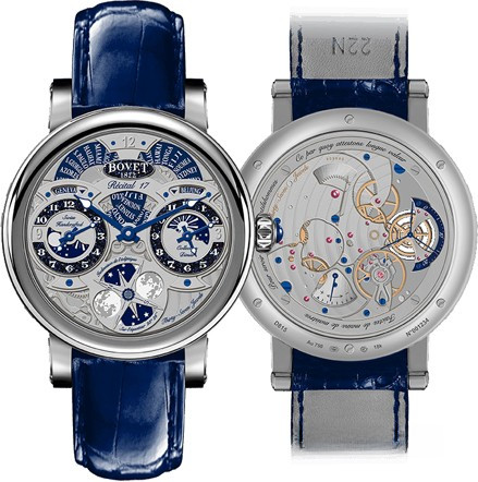 Collection Dimier Recital 17 - часы с трёх-часовым измерением времени, фазой луны. Корпус размером 45.3 х 15.6 мм выполнен из 18-каратного белого золото. Recital 17 оснащен дисплеем фазы Луны обеих полушарий. Циферблат из синего авантюрина, частично скелетирован. Две центральные стрелки показывают местное время. По обе стороны отображаются два других часовых пояса (в горизонтальном положении между 9 и 3 часами), часы и минуты. Каждый из них сопровождается индикатором день/ночь и диском 24 городов. Дисплей фазы Луны принял положение на 6 часов, который одновременно указывает на рост Луны в северном и южном полушарии. Нуждается в коррекции один день каждые 128 лет. Сапфировое стекло с антибликовым покрытием защищает часы по обе стороны. Задняя сторона часов с открытым видом на механизм с индикатором запаса хода который отображает 7 дней резерв хода. А также секундный счетчик с тройной секундной стрелкой. Модель часов оснащена мануфактурным часовым механизмом с ручным подзаводом, Калибр 13DM033FPL. Частота колебания баланса 21600 п/ч. Укомплектованы элегантным ремешком из кожи аллигатора, с классической пряжкой из белого золота.