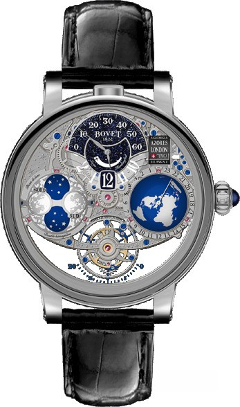 Индикация мирового времени у Bovet Récital 18 Shooting Star представлена при помощи полусферы. Такой подход позволяет определять время для всех часовых поясов, причем делать это можно одновременно. Bovet Récital 18 Shooting Star также обладает индикатором фазы Луны, который гармонично расположен с левой части циферблата. Время в часах Bovet Récital 18 Shooting Star отображается при помощи окошка прыгающего часа и ретроградной минутной шкалы на 12-ти часах. Между этими двумя индикаторами встроен индикатор запаса хода, который рассчитан на 5 дней. Еще одна полусфера на циферблате принадлежит турбйиону, который расположен на 6-ти часах. Турбийон работает с частотой 21 600 пк/час, каретка и мост турбийона украшены гравировкой, выполненной вручную. Корпус часов изготовлен из белого золота 18к, циферблат черного цвета, часы комплектуются ремешком из кожи аллигатора с вставкой из белого золота 18к. Модель выпущена ограниченной серией 50 штук.