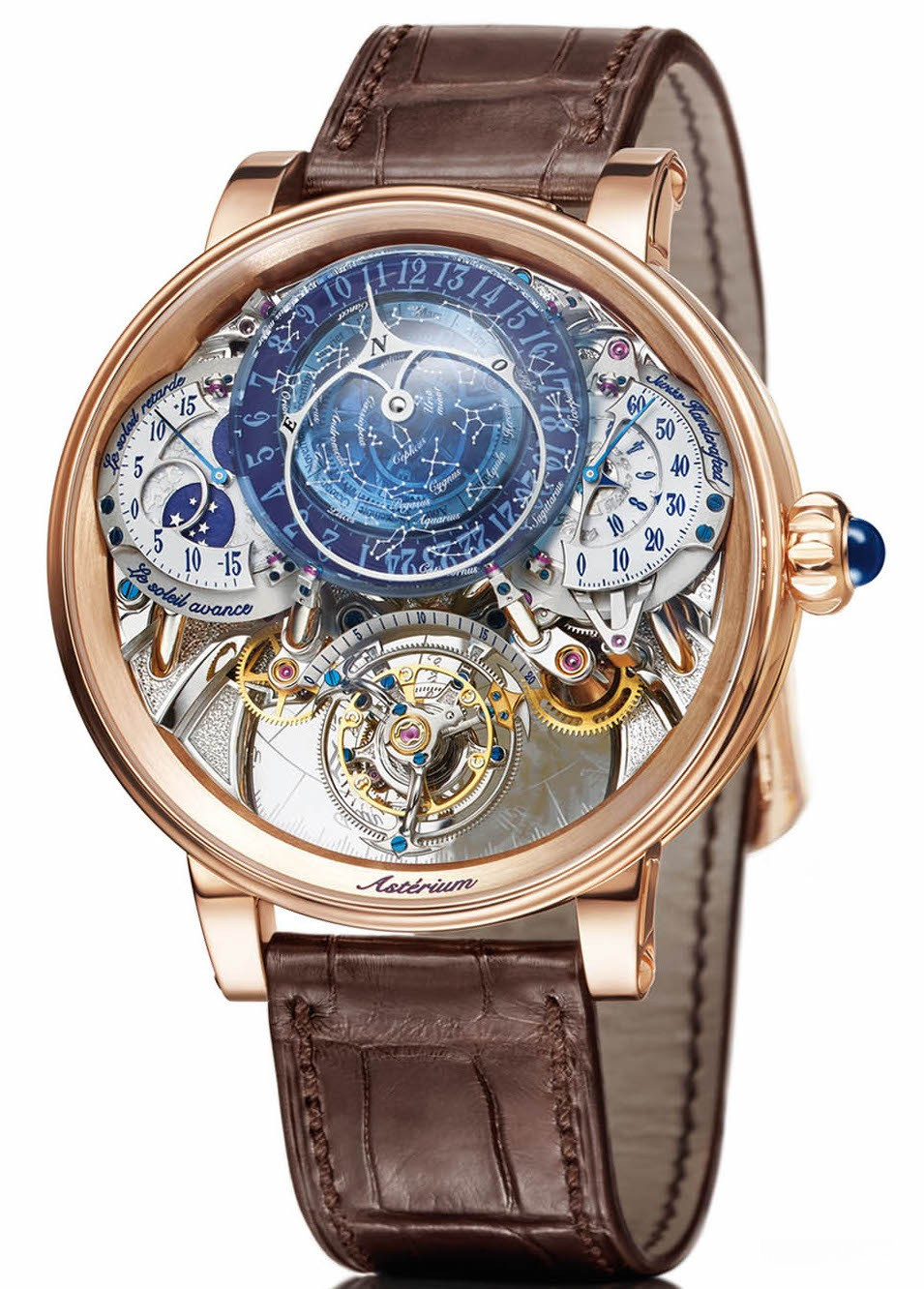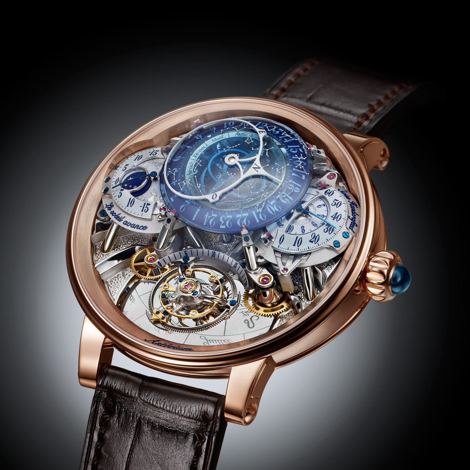 Главное место на циферблате новой эксклюзивной модели занимает карта звездного неба. В соответствии с принципами разработки сложных функций, принятыми в компании BOVET 1822, данный панорамный индикатор небосвода отвечает требованиям точности, функциональности и интуитивной читаемости показаний. Инженеры BOVET 1822 методом лазерной гравировки нанесли изображения звезд и созвездий, видимых с Земли, на купол из прозрачного синего кварца. Благодаря покрытию Super-LumiNova® звезды сияют на этом небосводе даже ярче, чем в действительности.Паскаль Раффи и его команда разработали сложнейший механизм звездного календаря.Края карты звездного неба возвышаются над двумя двойными полусферическими индикаторами. Слева расположен полусферический индикатор фаз Луны, возвышающийся над индикатором уравнения времени. Отображение секунд запатентованному двухстороннему «парящему» турбийону. Запас хода составляет 10 дней.