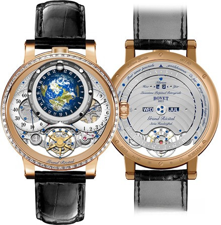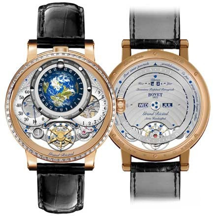 Bovet представили одни из самых сложных своих часов, которые когда-либо делали. В новинке объединились двусторонний турбийон и вечный календарь. Размер корпуса составляет 46.3 х 19.6 мм. Часы построены вокруг астрономической модели, которая показывает относительные положения Солнца, Луны и Земли. Полушарие, представляющее Землю, вращается один раз каждые 24 часа. Справа находится ретроградная индикация запаса хода, а слева - ретроградная индикация минут. Полукруглый секундный счетчик расположен рядом с турбийоном, а под ретроградными стрелками минут - увеличительное стекло, позволяющее прочитать дату. Задняя часть Recital 22 Grand Recital более сложна, чем циферблат многих сложных часов. На задней стороне часов находится вечный календарь. Часы комплектуются механизмом с ручным заводом, Калибр 17DM03-TEL с запасом хода в 9 дней. Безель из белых багетных бриллиантов.