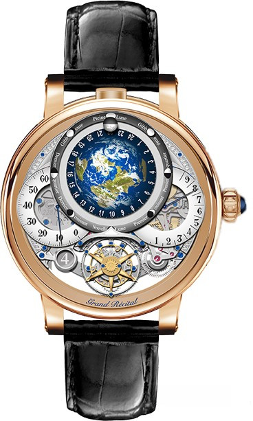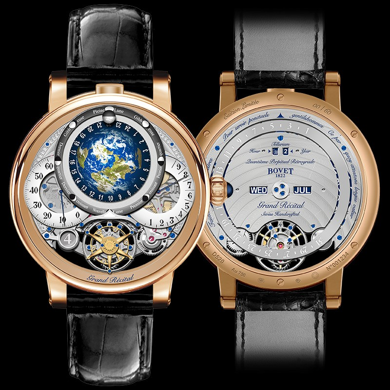 Bovet представили одни из самых сложных своих часов, которые когда-либо делали. В новинке объединились двусторонний турбийон и вечный календарь. Размер корпуса составляет 46.3 х 19.6 мм. Часы построены вокруг астрономической модели, которая показывает относительные положения Солнца, Луны и Земли. Полушарие, представляющее Землю, вращается один раз каждые 24 часа. Справа находится ретроградная индикация запаса хода, а слева - ретроградная индикация минут. Полукруглый секундный счетчик расположен рядом с турбийоном, а под ретроградными стрелками минут - увеличительное стекло, позволяющее прочитать дату. Задняя часть Recital 22 Grand Recital более сложна, чем циферблат многих сложных часов. На задней стороне часов находится вечный календарь. Часы комплектуются механизмом с ручным заводом, Калибр 17DM03-TEL с запасом хода в 9 дней.