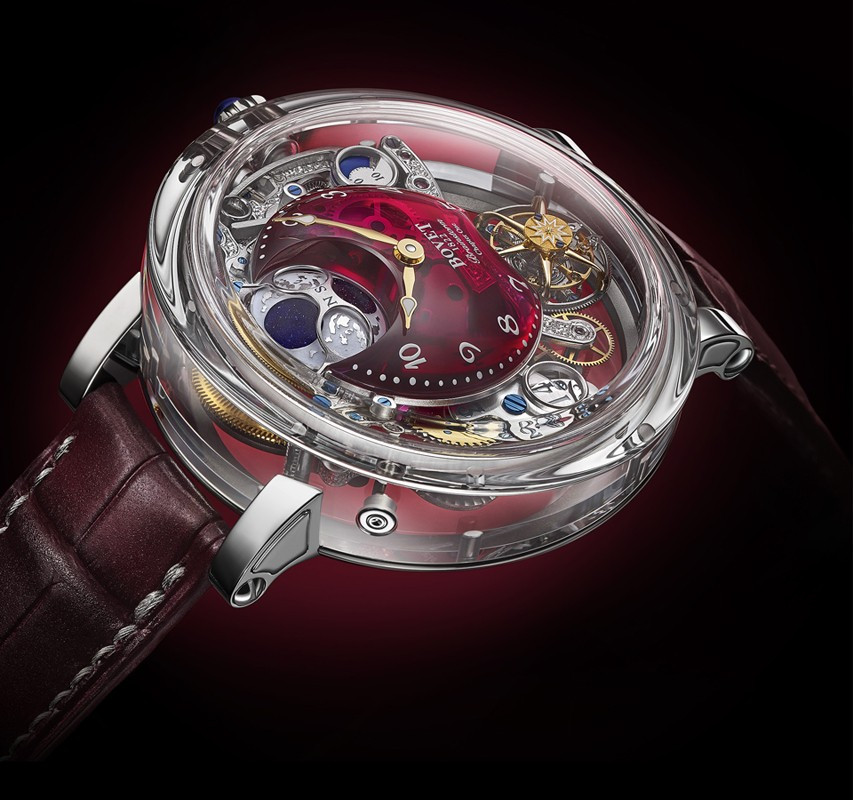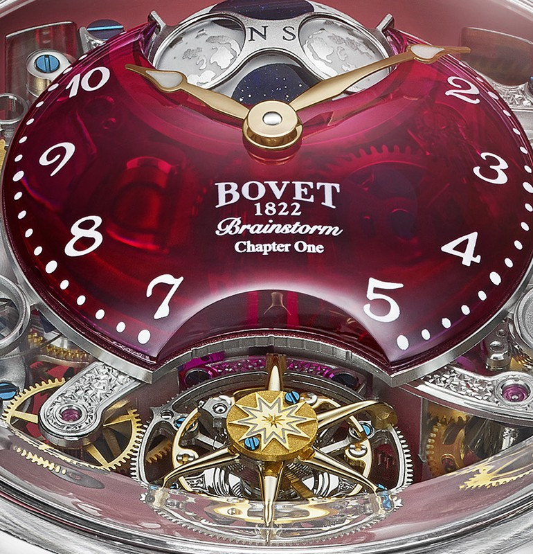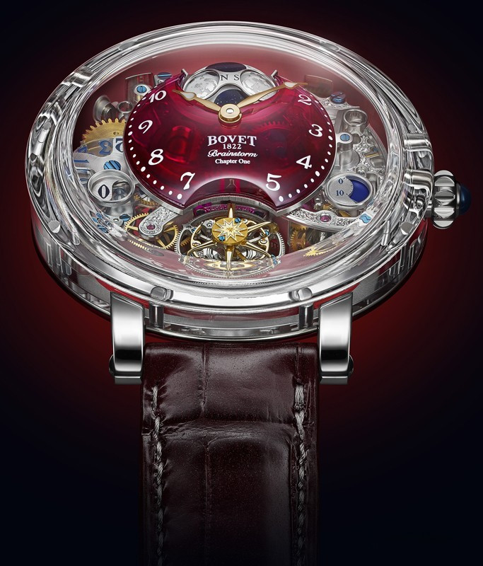 Часы Bovet Dimier Recital 26 Brainstorm Chapter One представлены в корпусе из из сапфира с титановыми ушками размером 48 х 15.5 мм и водонепроницаемостью 30 м. Внутри корпуса установлен механизм с ручным заводом, Калибр 17DM04-SMP, обладающий запасом хода 10 дней. На красном скелетированном циферблате отображаются часы, минуты, секунды, дата, запас хода, фаза луны. Часы комплектуются ремешком из кожи аллигатора с вставкой из белого золота 18к.