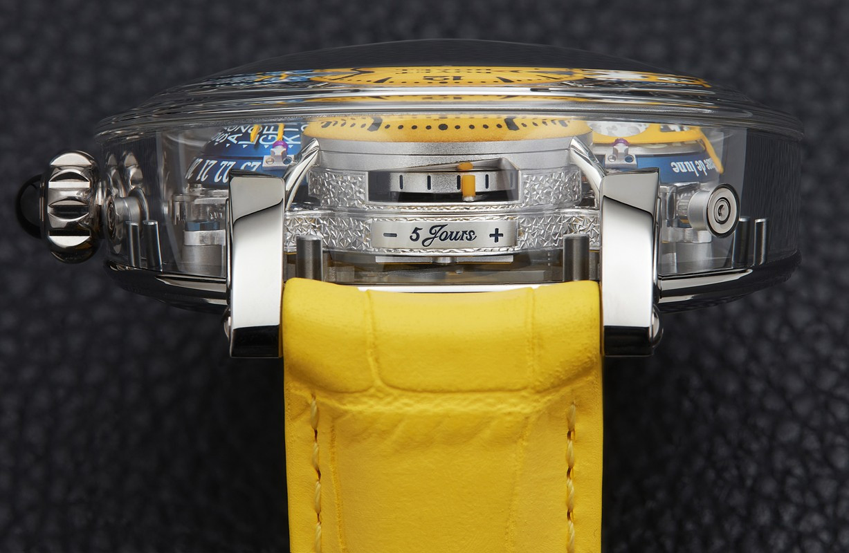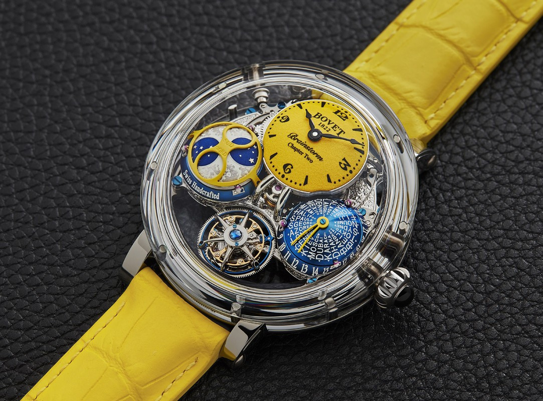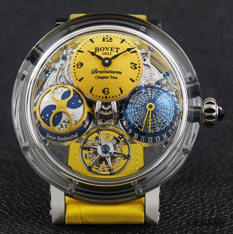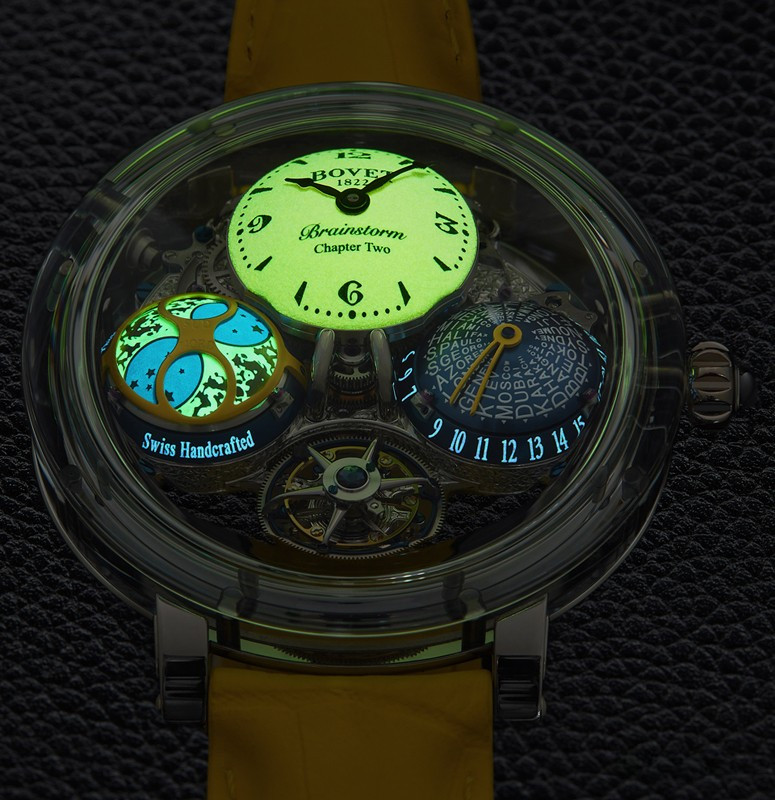 Bovet 1822 представляет новую уникальную модель Sunshine, в которой изначально всего семь экземпляров Brainstorm Chapter Two с великолепными циферблатами желтого цвета. Механизм новых Récital 26 Brainstorm® Chapter Two Sunshine полностью украшен ручной гравировкой и установлен в корпус типа «наклонное бюро», искусно вырезанный из цельного сапфира (47,8 мм). Желтый куполообразный циферблат вручную покрыт зеленым составом Super-LumiNova®, создающим ощущение порошковой отделки. Желтый циферблат накапливает солнечный свет и начинает светиться ярко-зеленым светом в сумерках. Часы Récital 26 Brainstorm® Chapter Two также имеют запатентованный двусторонний парящий турбийон, запатентованную систему радиальных направляющих, трехмерный индикатор фаз Луны с пятидневным запасом хода и запатентованный трехмерный V-образный указатель часового пояса. Это инновационное сочетание, задуманное г-ном Раффи, а также куполообразная форма, обеспечивают интуитивно понятную индикацию мирового времени и чтение показаний для каждого из 24 часовых поясов одновременно.