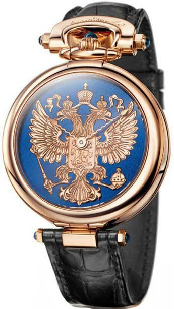 Круглый корпус Amadeo Fleurier 43 выполнен из розового золота 18 карат, диаметром 43 мм. На креплениях ремешка и заводной головке установлены синие сапфиры кабошоны. Циферблат синий с изображением российского герба. Фирменные, рифленые, золотые, центральная часовая и минутная стрелки. Как и все часы коллекции Fleurier Amadeo, модель может легко превращается из наручных часов в карманные или настольные, а также - носиться, как ожерелье, на цепочке. Модель оснащена мануфактурным автоматическим механизмом Bovet Fleurier 11BA12 с запасом хода 72 часа, с гильошированным золотым ротором 22 карат. Ремешок из кожи аллигатора черного цвета с классической застежкой из розового золота 18 карат.