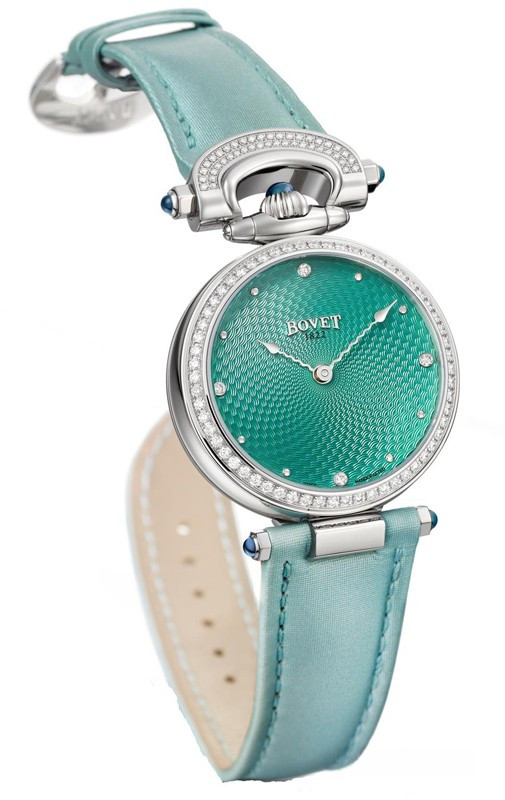 Часовой бренд Bovet пополнил свою коллекцию Fleurier Amadeo новой миниатюрной моделью 36 Miss Audrey. Круглый корпус Amadeo Fleurier 36 Miss Audrey выполнен из нержавеющей стали, диаметром 36 мм. Заводной ключ и крепления для ремешка инкрустированы синими сапфирами кабошонами. Безель и заводная головка инкрустированы 103 белыми бриллиантами весом 0.99 ct. Циферблат бирюзовый жемчужный гильошированный с 4-мя бриллиантовыми часовыми маркерами. Как и все часы коллекции Fleurier Amadeo, модель может легко превращается из наручных часов в карманные или настольные, а также - носиться, как ожерелье, на цепочке. Модель оснащена мануфактурным автоматическим механизмом Bovet Fleurier 11BA15 с запасом хода 42 часа. Ремешок сатиновый бирюзового цвета с классической застежкой из нержавеющей стали.