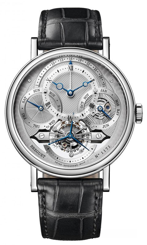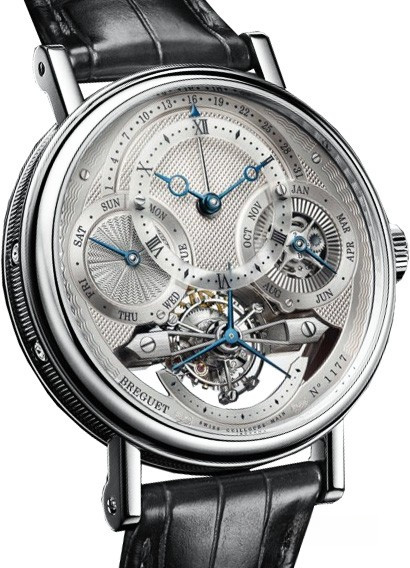 Корпус из платины 950 с тонким рифлением на боковых поверхностях. Задняя крышка корпуса выполнена из сапфирового стекла. Диаметр: 41 мм. Приваренные ушки со стержнями, закрепленными винтами. Водонепроницаемость до 3 бар (30 метров). Циферблат из 18-каратного золота, посеребренного с четырьмя разными гильошированными узорами. Проставлены индивидуальный номер и подпись «Breguet». Отдельный циферблат с индикацией римскими цифрами на сапфировом диске. Стрелки «Breguet» из вороненой стали с открытым наконечником. Ретроградная индикация даты в положении «на 12 часов», индикация дней в положении «на 9 часов», индикация месяцев и високосных лет в положении «на 3 часа». Вспомогательный циферблат с малой секундной стрелкой расположен на оси турбийона. Механизм с ручным подзаводом с турбийоном и вечным календарем. Пронумерован, имеет надпись «Breguet». Калибр 558QP2. 14 ½ линий, 21 камень. Запас хода 50 часов. Боковой анкерный спуск и балансир с регулировочными винтами на пружине «Breguet». Частота колебаний 2.5 Гц. Механизм отрегулирован в 6 положениях. Кожаный ремешок со складной тройной застежкой.