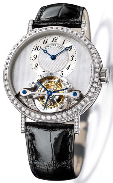 Наручные часы из 18-каратного белого золота. Механизм с ручным заводом 558.1 с запасом хода 50 часов. Смещенный в положение "12 часов" циферблат с часовой и минутной стрелками. Арабские цифры Breguet. Безель и крепления ремешка украшены 74 бриллиантами (около 1,33 карата). Каретка турбийона в положении "6 часов". Указатель секунд вокруг каретки турбийона. Автокомпенсирующая спираль с концевыми кривыми Breguet. Задняя крышка из сапфирового стекла. Водонепроницаемость до 30 м. Традиционная застежка украшена 25 бриллиантами общим весом около 0,134 карата. Размер корпуса 35 x 9.15 мм.