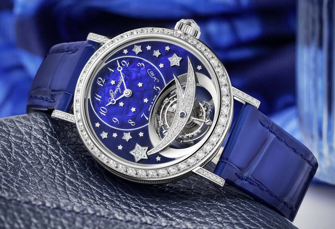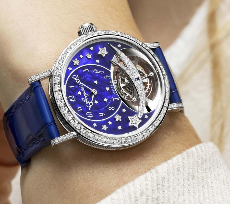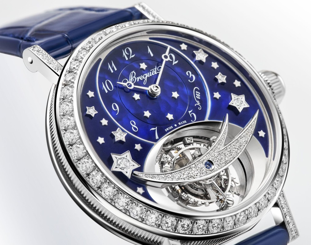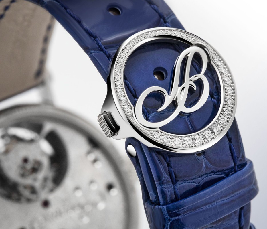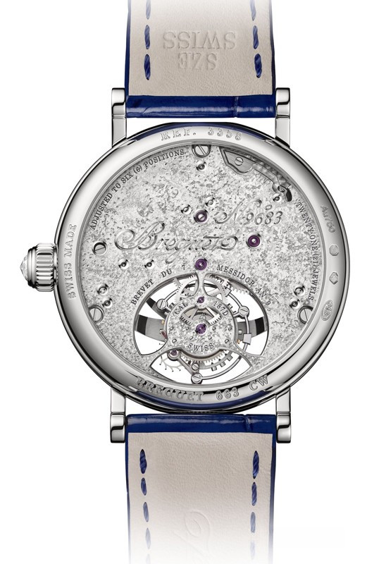 Наручные часы из 18-каратного белого золота. Механизм с ручным заводом 187D с запасом хода 50 часов. Смещенный в положение "12 часов" циферблат с часовой и минутной стрелками. Арабские цифры Breguet. Безель и крепления ремешка украшены белыми бриллиантами. Каретка турбийона в положении "6 часов". Автокомпенсирующая спираль с концевыми кривыми Breguet. Задняя крышка из сапфирового стекла. Водонепроницаемость до 30 м. Размер корпуса 35 x 9.43 мм.