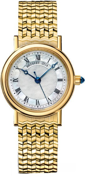 Часы Breguet Classique Lady выпущены в корпусе из желтого золота 18к, размером 30 х 7,85 мм и водонепроницаемостью 30 м, заводной головкой икрустированой синим сапфиром. Внутри корпуса установлен автоматический механизм, Калибр 537/1. На серебристом гильошированном циферблате отображаются часы, минуты, секунды. Запас хода 40 часов. Часы комплектуются браслетом из желтого золота 18к.