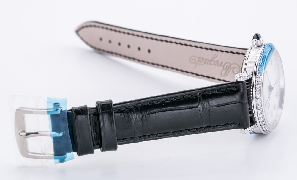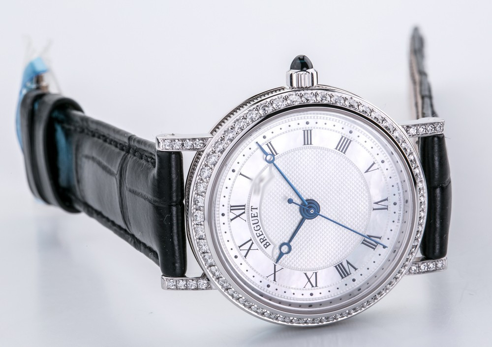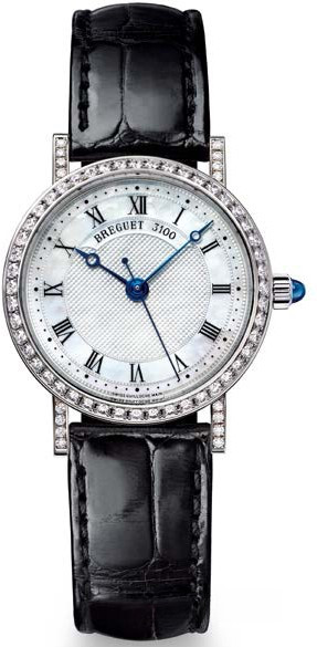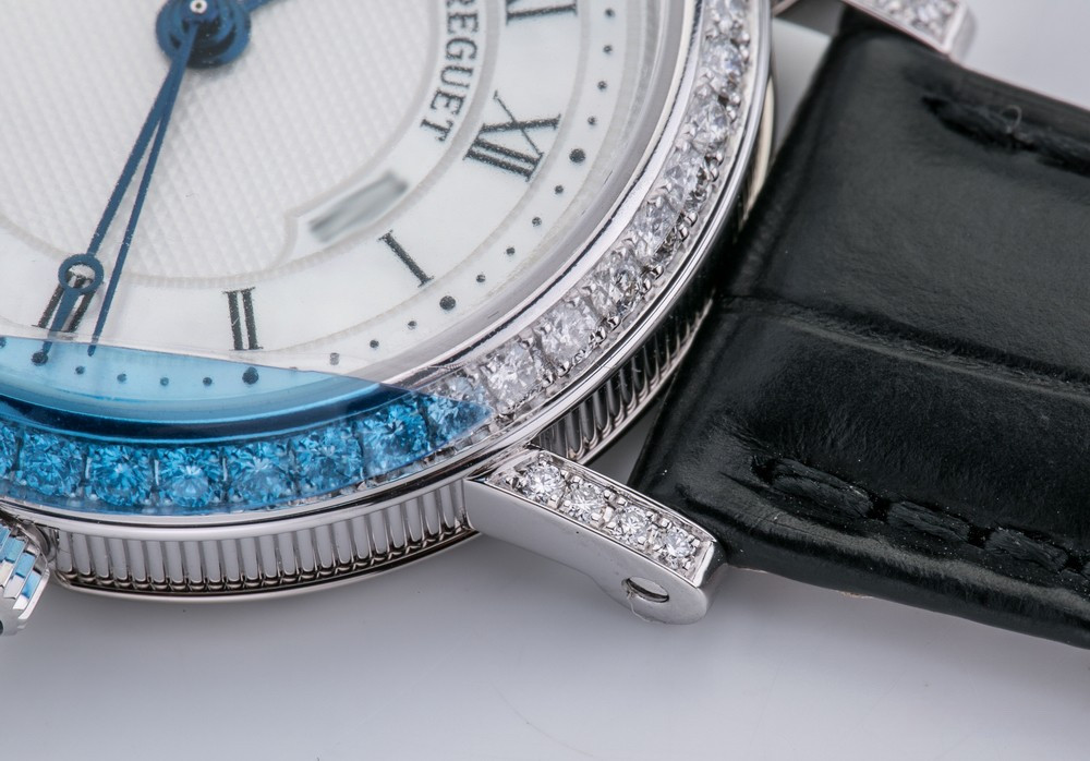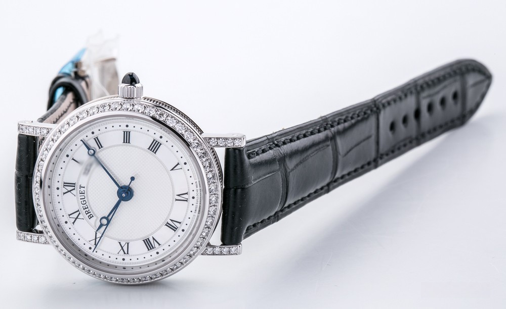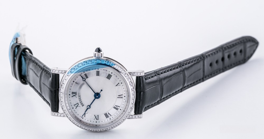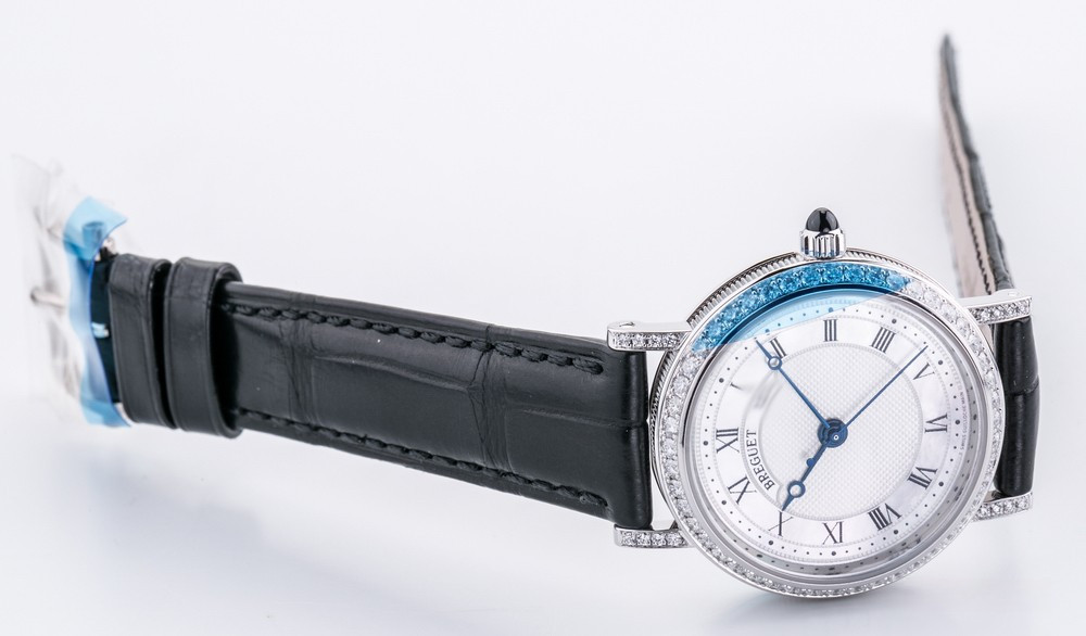 Breguet Classique Lady выпущены в корпусе из белого золота 18к размером 30 х 7.85 мм и водонепроницаемостью до 30 метров. На белом жемчужном гильошированном циферблате расположены центральные стрелки из вороненой стали с характерными яблоками Бреге на кончиках. Внутри корпуса установлен автоматический Калибр 537/1 с запасом хода 40 часов и функциями часов, минут и секунд. Безель из 48-и белых бриллиантов 0.98 ct., ушки инкрустированы белыми бриллиантами, заводная головка инкрустирована синим сапфиром кабошоном. Часы комплектуются черным ремешком из кожи аллигатора с застежкой из белого золота 18к.