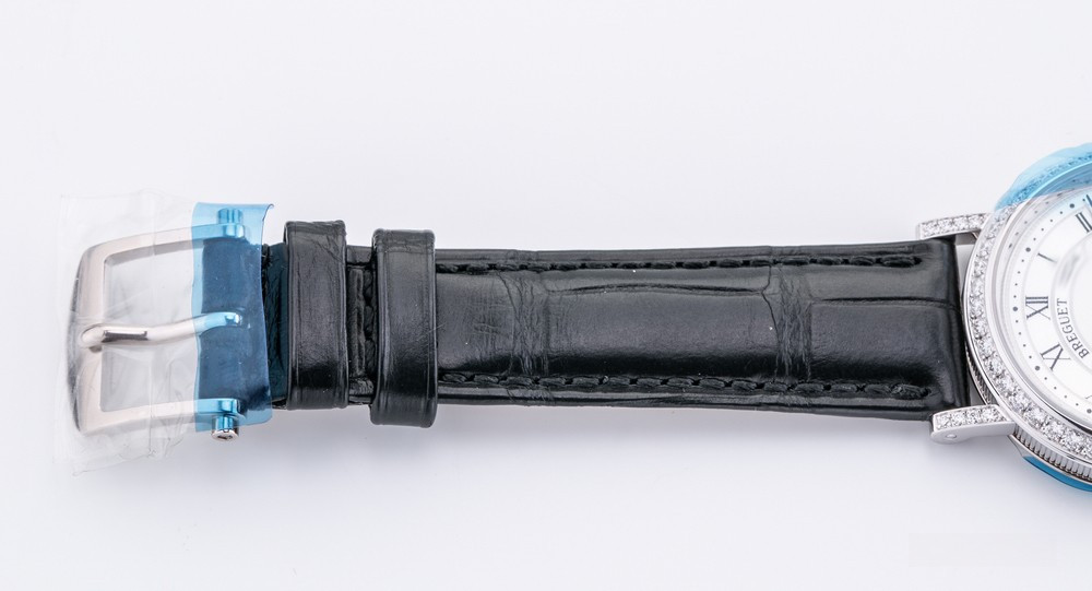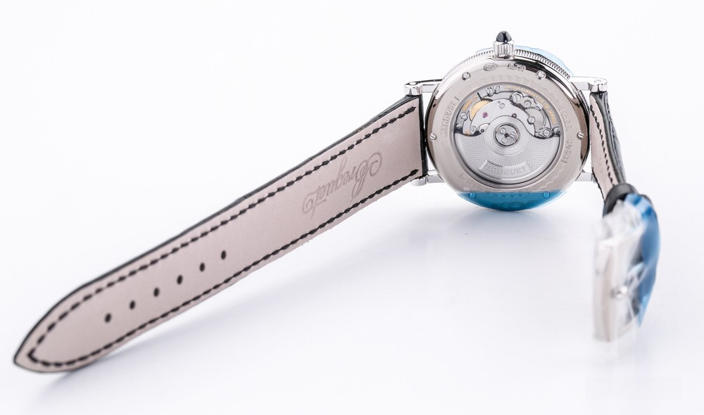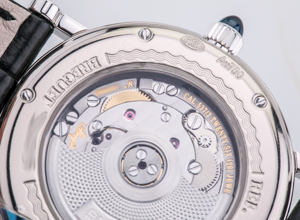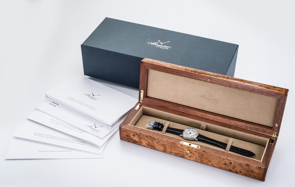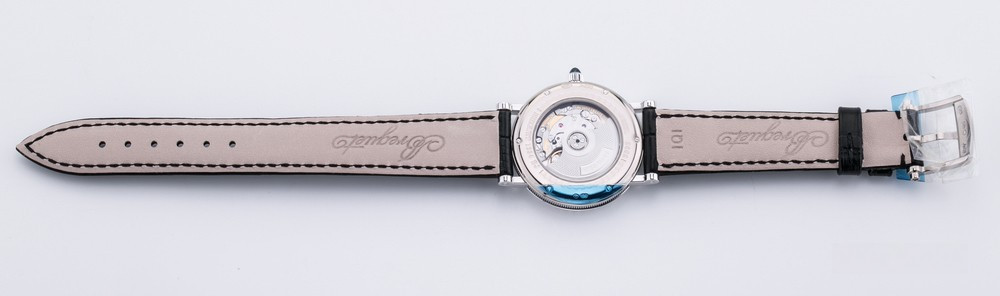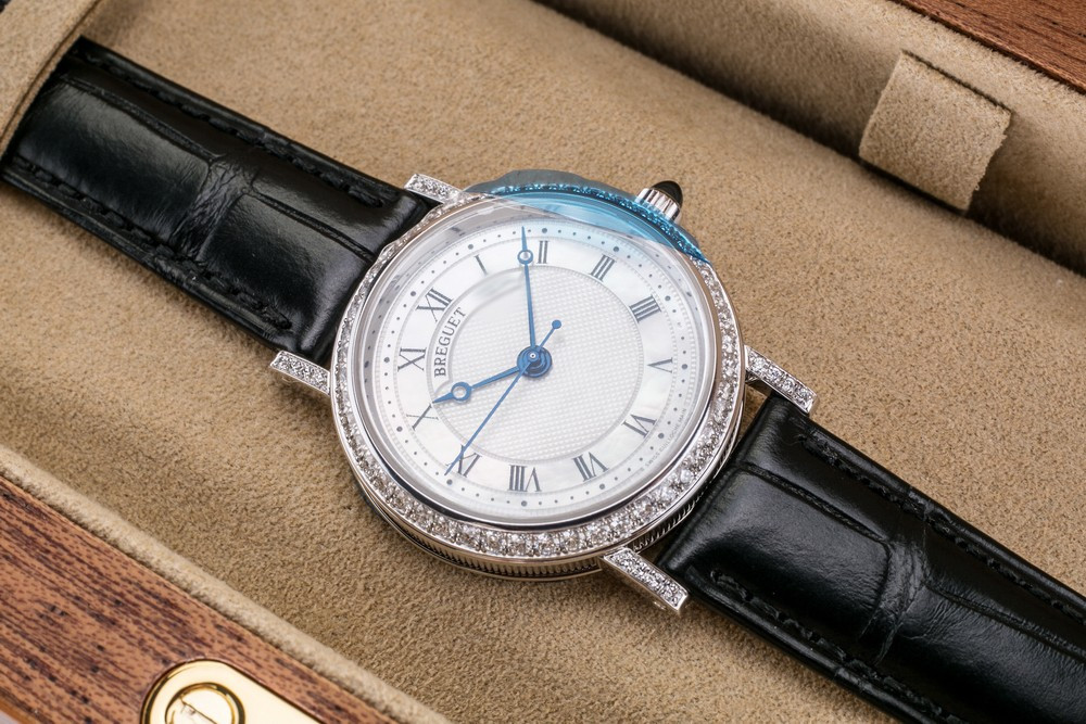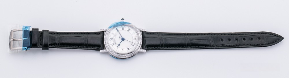 Breguet Classique Lady выпущены в корпусе из белого золота 18к размером 30 х 7.85 мм и водонепроницаемостью до 30 метров. На белом жемчужном гильошированном циферблате расположены центральные стрелки из вороненой стали с характерными яблоками Бреге на кончиках. Внутри корпуса установлен автоматический Калибр 537/1 с запасом хода 40 часов и функциями часов, минут и секунд. Безель из 48-и белых бриллиантов 0.98 ct., ушки инкрустированы белыми бриллиантами, заводная головка инкрустирована синим сапфиром кабошоном. Часы комплектуются черным ремешком из кожи аллигатора с застежкой из белого золота 18к.