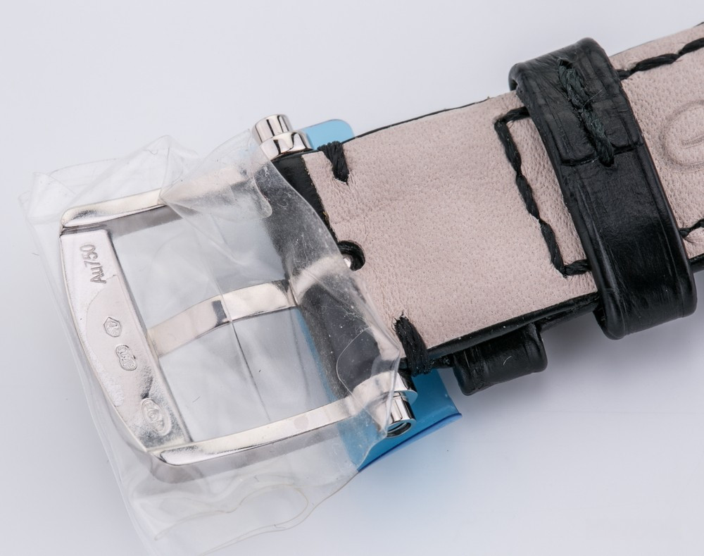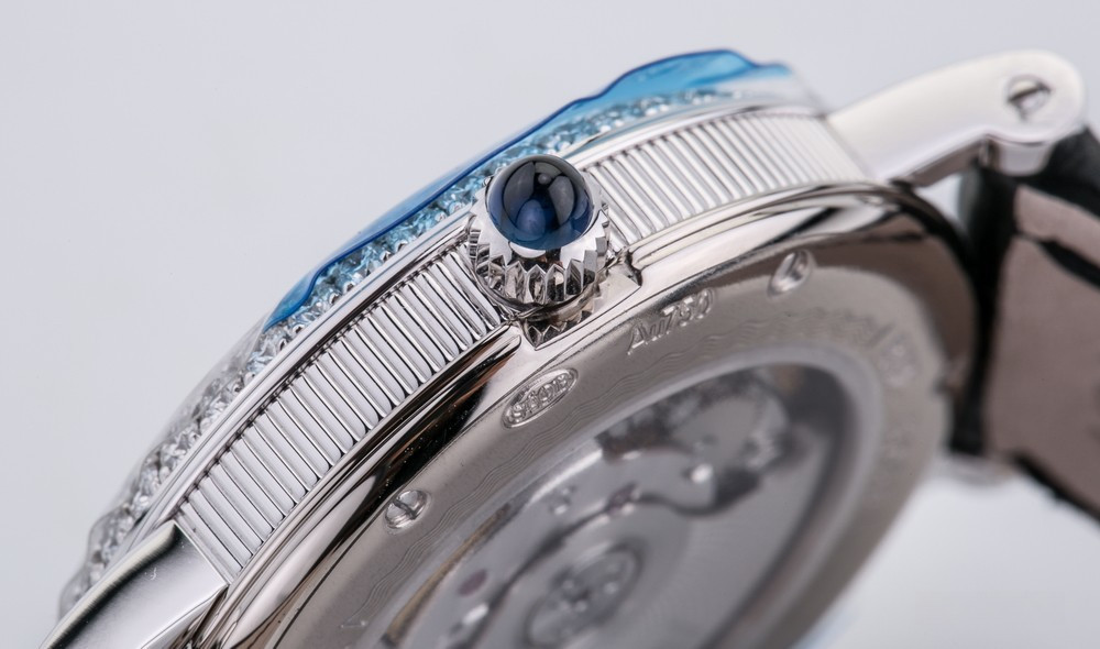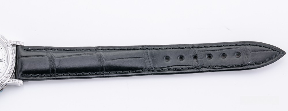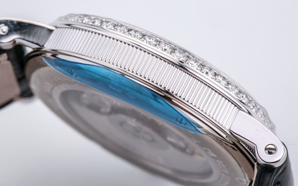 водонепроницаемость 30 м, безель из 48-и белых бриллиантов 0.98 ct., ушки инкрустированы белыми бриллиантами, заводная головка инкрустирована синим сапфиром кабошоном