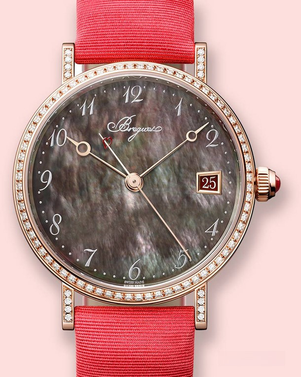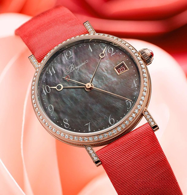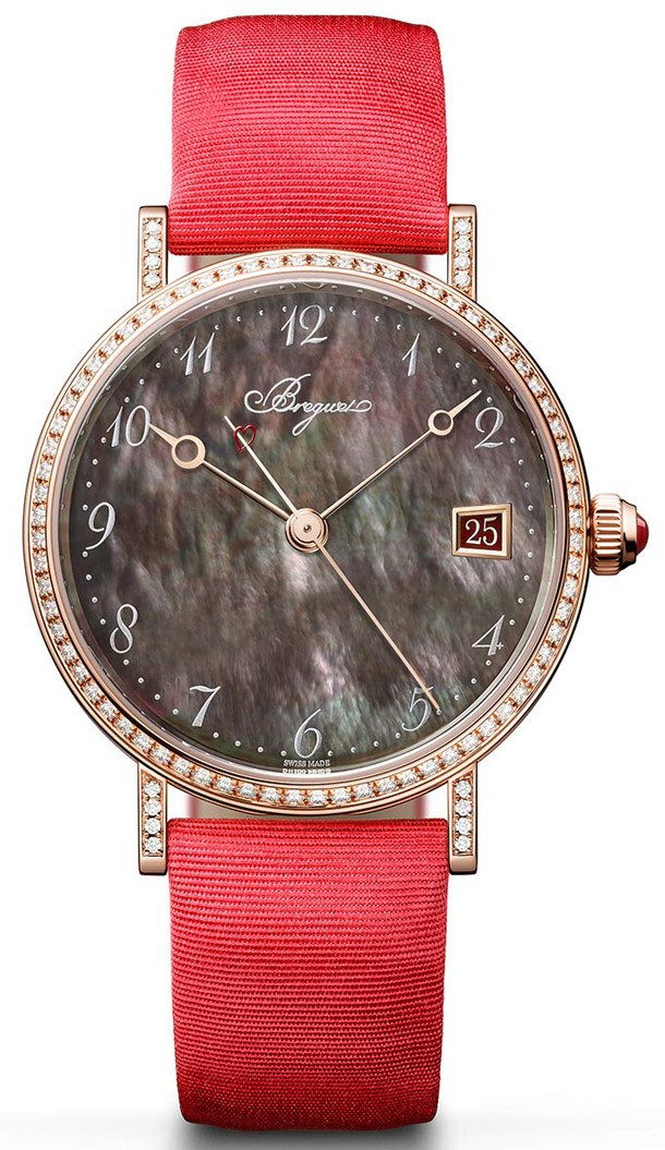 Компания Breguet представила модель Classique 9065 Tahitian Mother-Of-Pearl как часть эксклюзивной серии из 28 пронумерованных часов, изготовленных специально для фирменных бутиков. Рифленый корпус из розового золота 18к в размере составляет 33.5 х 7.55 мм. Его украшает коронка с рубином. Безель инкрустирован 88-ю бриллиантами круглой огранки общим весом около 0.606 карата. Циферблат изготовлен из черного таитянского перламутра. надпись Breguet расположена на 12-ти часах.Время отображается при помощи фирменных арабских цифр Breguet. Дата отображается в апертуре на 3-х часах: бежевые цифры на бордовом фоне. Стрелки Breguet изготовлены из розового золота. Секундная стрелка украшена сердечком. Задняя крышка из сапфирового стекла открывает вид на автоматический механизм Калибр 591A. Балансовая частота составляет 4 Гц (28 800 полуколебаний в час), запас хода 38 часов. Механизм оснащен балансировочной пружиной, рычагом и спусковым колесом из кремния для повышения точности и устойчивости к магнитным полям. Часы поставляются на красном атласном ремешке с пряжкой из розового золота 18к. Водонепроницаемость корпуса до 30 метров.