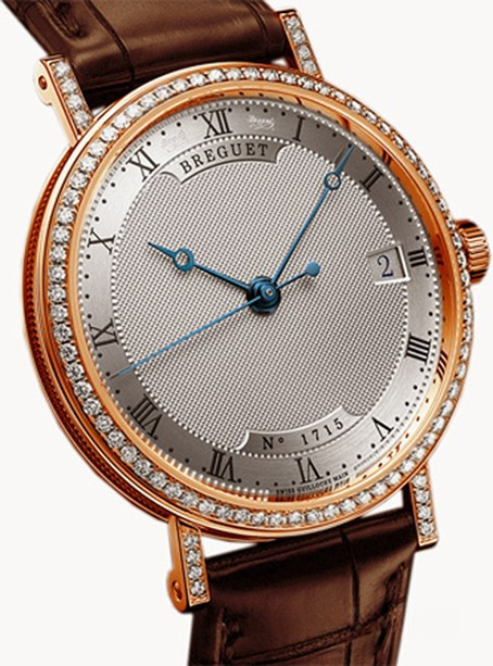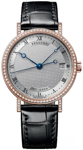 Корпус из 18-каратного розового золота с тонким рифлением на боковых поверхностях. Безель и ушки украшены 88 бриллиантами бриллиантовой огранки (около 0,606 карата). Задняя крышка корпуса выполнена из сапфирового стекла. Диаметр 33,5 мм. Приваренные ушки со стержнями, закрепленными винтами. Водонепроницаемость до 3 бар (30 метров). Циферблат из 18-каратного золота, посеребренный и гильошированный. Проставлены индивидуальный номер и подпись «Breguet». Отдельный циферблат с индикацией римскими цифрами. Центральная секундная стрелка; индикатор даты в положении «на 3 часа». Стрелки «Breguet» из вороненой стали с открытым наконечником. Механизм с автоматическим подзаводом. Пронумерованный с надписью «Breguet». Калибр 591A. 11 ½ линий, 25 камней. Запас хода 38 часов. Прямолинейный швейцарский анкерный спуск из кремния. Кремниевая балансирная пружина. Частота колебаний 4 Гц. Механизм отрегулирован в 6 положениях. Ремешок кожаный.