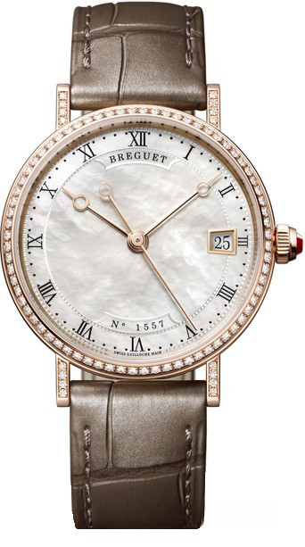 Корпус из 18-каратного розового золота с тонким рифлением на боковых поверхностях. Безель и ушки украшены 88 бриллиантами бриллиантовой огранки (около 0,606 карата). Задняя крышка корпуса выполнена из сапфирового стекла. Диаметр 33,5 мм. Приваренные ушки со стержнями, закрепленными винтами. Водонепроницаемость до 30 метров. Циферблат белый жемчужный. Проставлены индивидуальный номер и подпись «Breguet». Отдельный циферблат с индикацией римскими цифрами. Центральная секундная стрелка; индикатор даты в положении «на 3 часа». Стрелки «Breguet» из вороненой стали с открытым наконечником. Механизм с автоматическим подзаводом. Пронумерованный с надписью «Breguet». Калибр 591A. 11 ½ линий, 25 камней. Запас хода 38 часов. Прямолинейный швейцарский анкерный спуск из кремния. Кремниевая балансирная пружина. Частота колебаний 4 Гц. Механизм отрегулирован в 6 положениях. Ремешок кожаный.