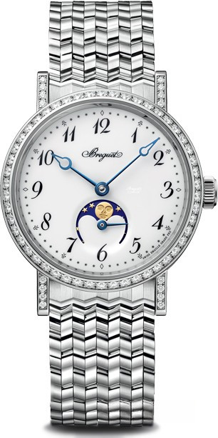 Женские часы Breguet обладают своим собственным неповторимым шармом. На белом циферблате расположена минутная шкала и римские цифры. Фигурная апертура фазы Луны совмещена с индикатором малой секундной стрелки и расположена на 6-ти часах. Стрелки Бреге стилизованы особым образом, добавляя романтизма в новинку. Механизм с автоматическим заводом Breguet 537L великолепно отделан и помещен под прозрачное сапфировое стекло задней части корпуса. Корпус часов изготовлен из белого золота 18к, диаметр составляет 30 мм. Часы комплектуются браслетом из белого золота 18к. Корпус инкрустирован белыми бриллиантами.