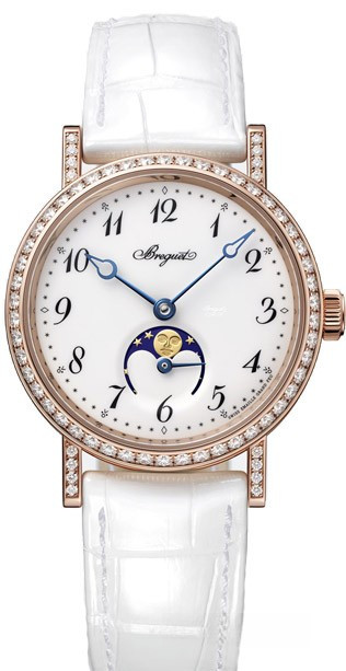 Женские часы Breguet обладают своим собственным неповторимым шармом. На белом циферблате расположена минутная шкала и римские цифры. Фигурная апертура фазы Луны совмещена с индикатором малой секундной стрелки и расположена на 6-ти часах. Стрелки Бреге стилизованы особым образом, добавляя романтизма в новинку. Механизм с автоматическим заводом Breguet 537L великолепно отделан и помещен под прозрачное сапфировое стекло задней части корпуса. Корпус часов изготовлен из розового золота 18к, диаметр составляет 30 мм. Часы комплектуются ремешком из кожи аллигатора с золотой застежкой. Корпус инкрустирован белыми бриллиантами.