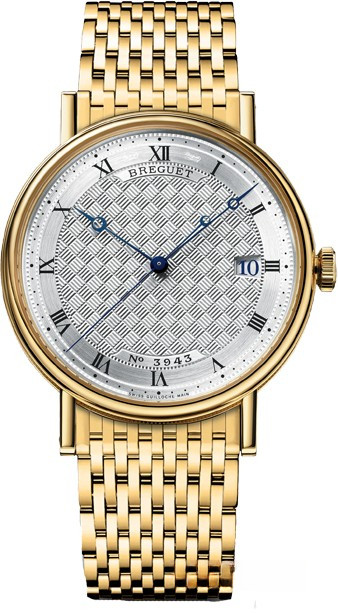 Часы Breguet изготовлены из желтого золота 18к. Корпус размером 38 x 8.25 мм водонепроницаем до 30 метров. Внутри корпуса находится автоматический Калибр 240 с запасом хода 55 часов и функциями часов, минут, секунд и даты. Часовая, минутная и секундная стрелки расположены по центру серебристого гильошированного циферблата. На концах часовой и минутной стрелок из вороненой стали расположены яблоки Бреге. По внутреннему ранту нанесены римские цифры. Апертура даты находится на 3-х часах. Швейцарские часы комплектуются браслетом из желтого золота 18к.