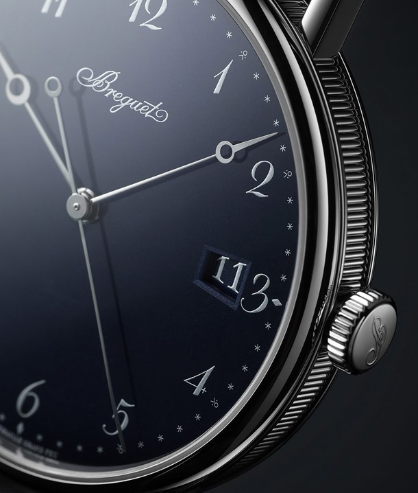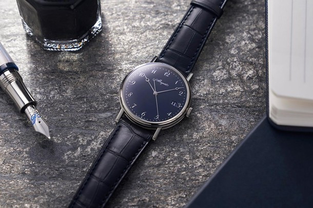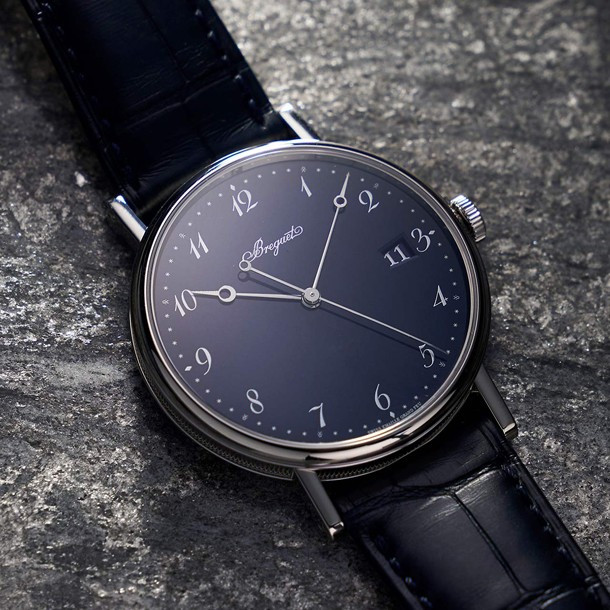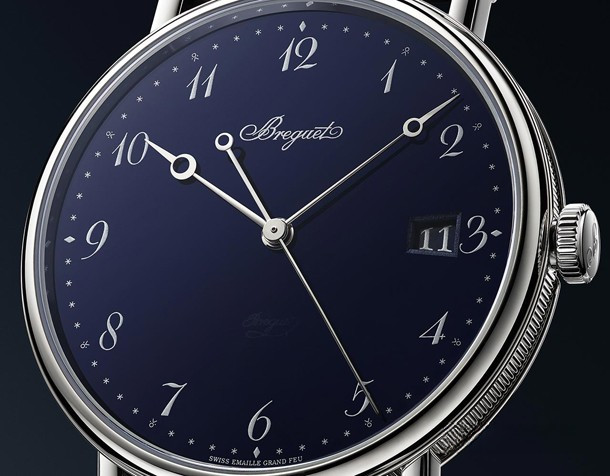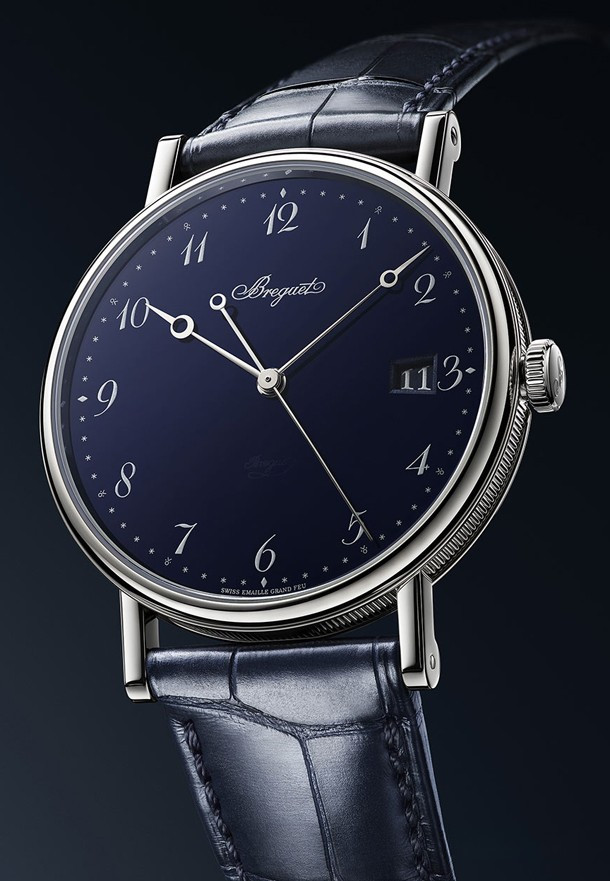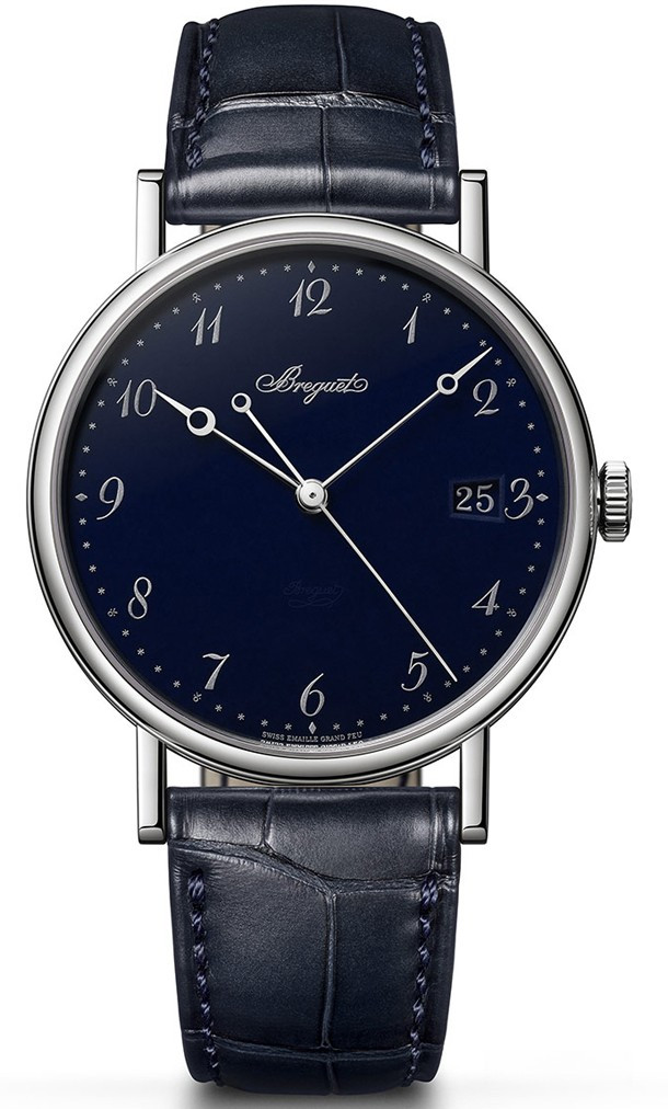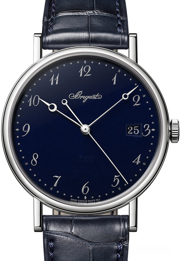 Часы Breguet изготовлены из белого золота 18к. Корпус размером 38 x 8.25 мм водонепроницаем до 30 метров. Внутри корпуса находится автоматический Калибр 240 с запасом хода 55 часов и функциями часов, минут, секунд и даты. Часовая, минутная и секундная стрелки расположены по центру синего циферблата. На концах часовой и минутной стрелок расположены яблоки Бреге. По внутреннему ранту нанесены арабские цифры. Апертура даты находится на 3-х часах. Швейцарские часы комплектуются ремешком из кожи аллигатора с вставкой из белого золота 18к.