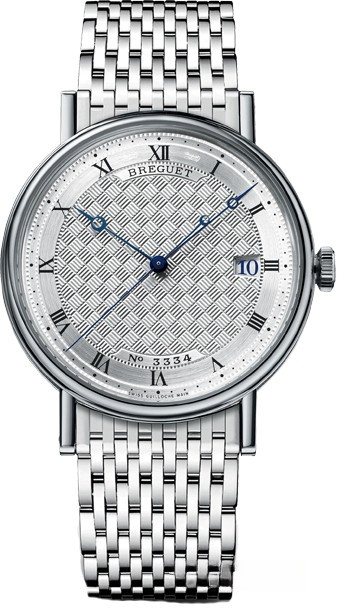 Часы Breguet изготовлены из белого золота 18к. Корпус размером 38 x 8.25 мм водонепроницаем до 30 метров. Внутри корпуса находится автоматический Калибр 240 с запасом хода 55 часов и функциями часов, минут, секунд и даты. Часовая, минутная и секундная стрелки расположены по центру серебристого гильошированного циферблата. На концах часовой и минутной стрелок из вороненой стали расположены яблоки Бреге. По внутреннему ранту нанесены римские цифры. Апертура даты находится на 3-х часах. Швейцарские часы комплектуются браслетом из белого золота 18к.
