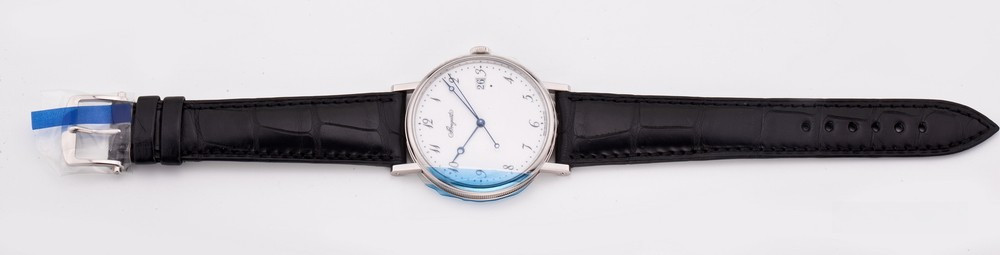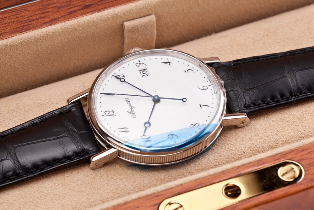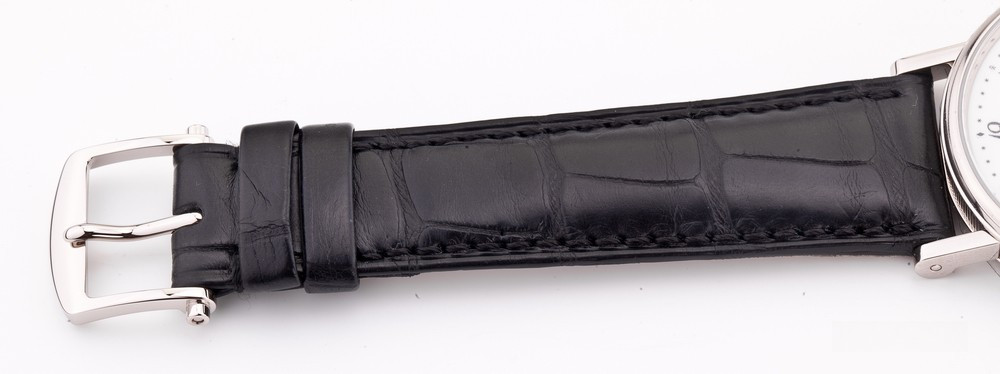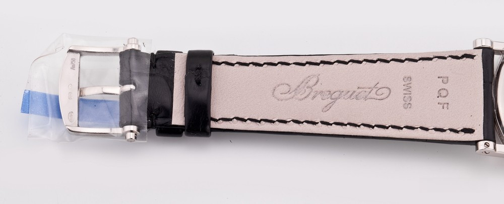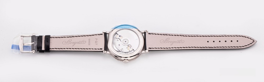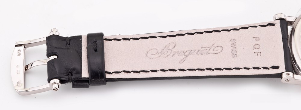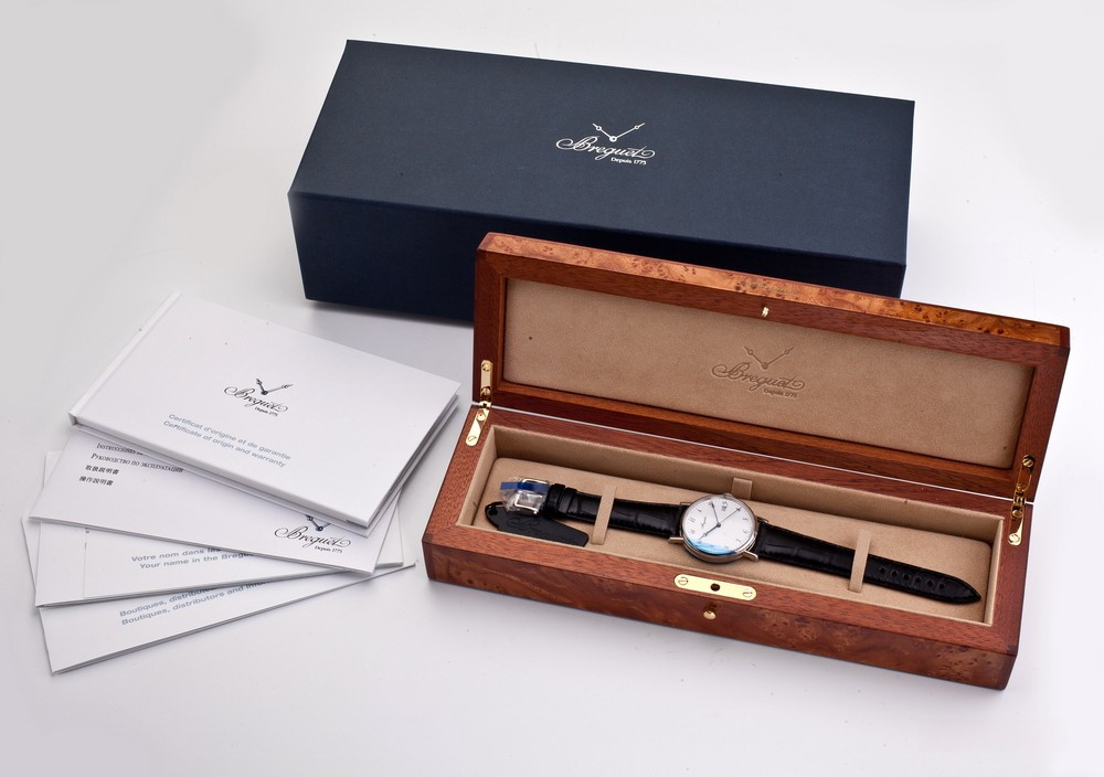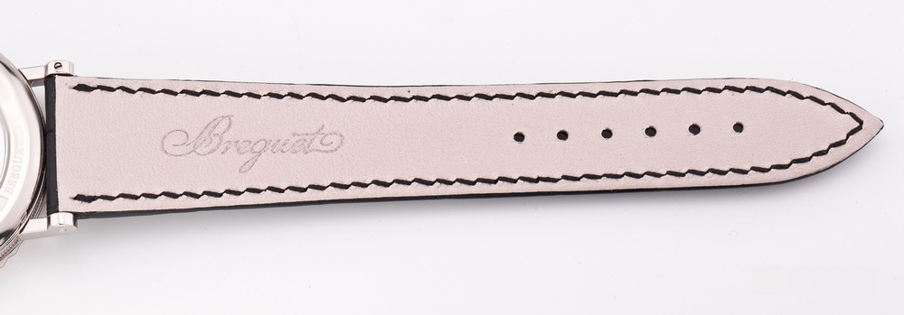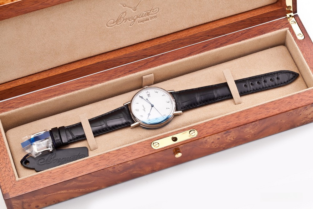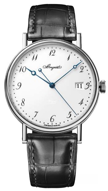 Часы Breguet изготовлены из белого золота 18к. Корпус размером 38 x 8.25 мм водонепроницаем до 30 метров. Внутри корпуса находится автоматический Калибр 240 с запасом хода 55 часов и функциями часов, минут, секунд и даты. Часовая, минутная и секундная стрелки расположены по центру белого эмалированного циферблата. На концах часовой и минутной стрелок из вороненой стали расположены яблоки Бреге. По внутреннему ранту нанесены арабские цифры. Апертура даты находится на 3-х часах. Швейцарские часы комплектуются черным ремешком из кожи аллигатора с застежкой из белого золота 18к.