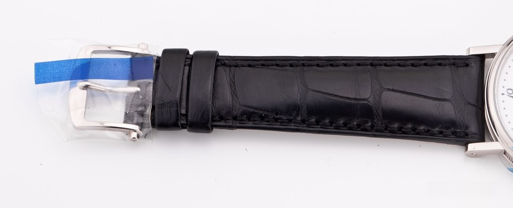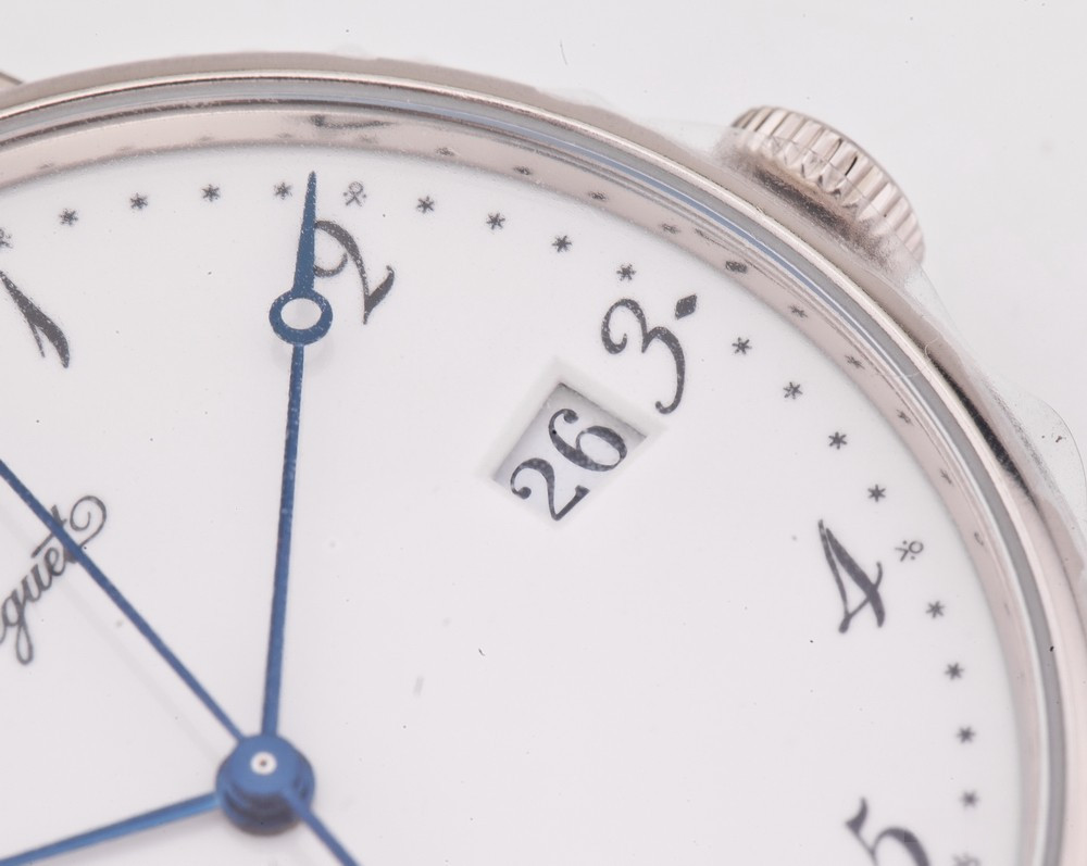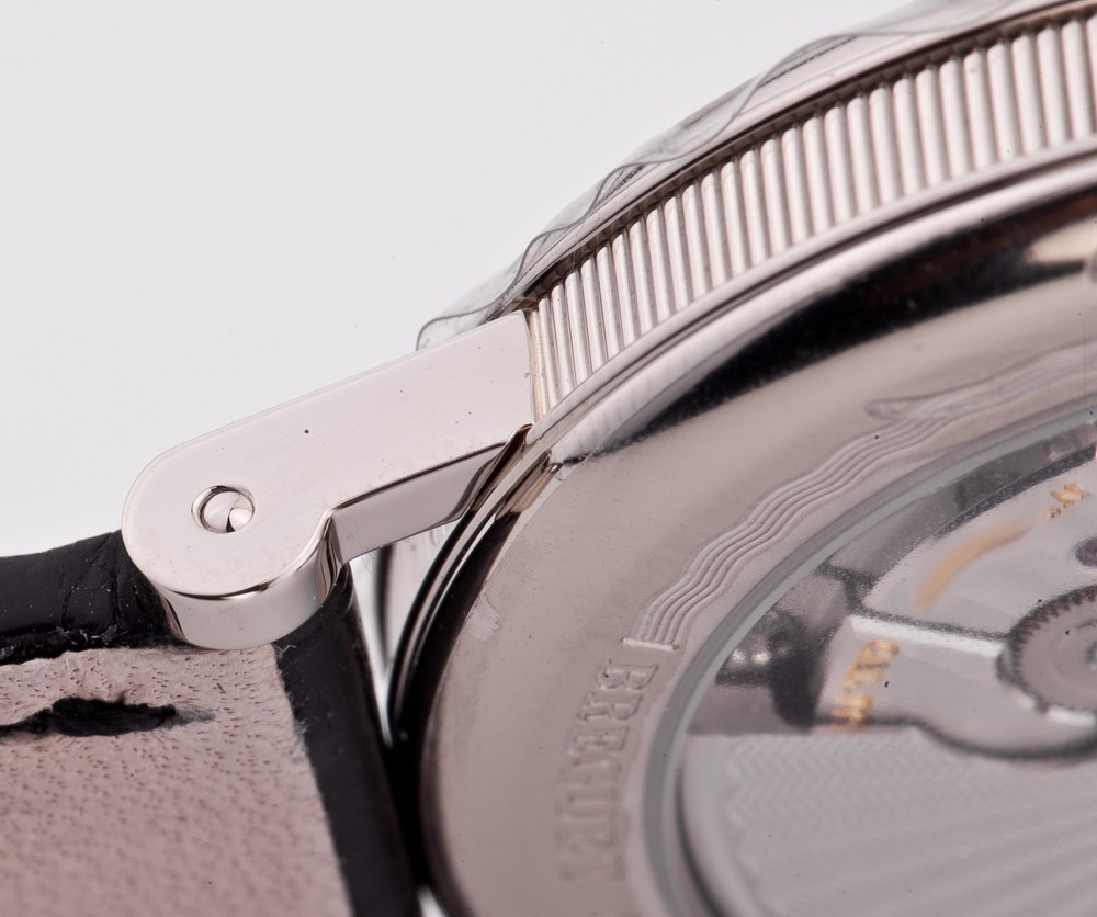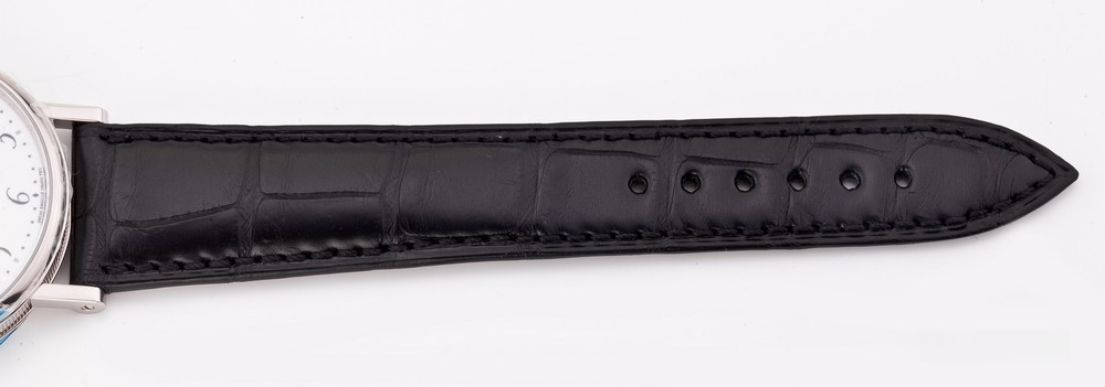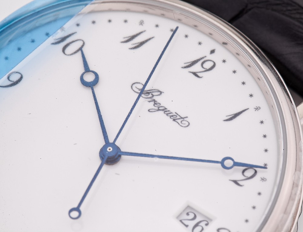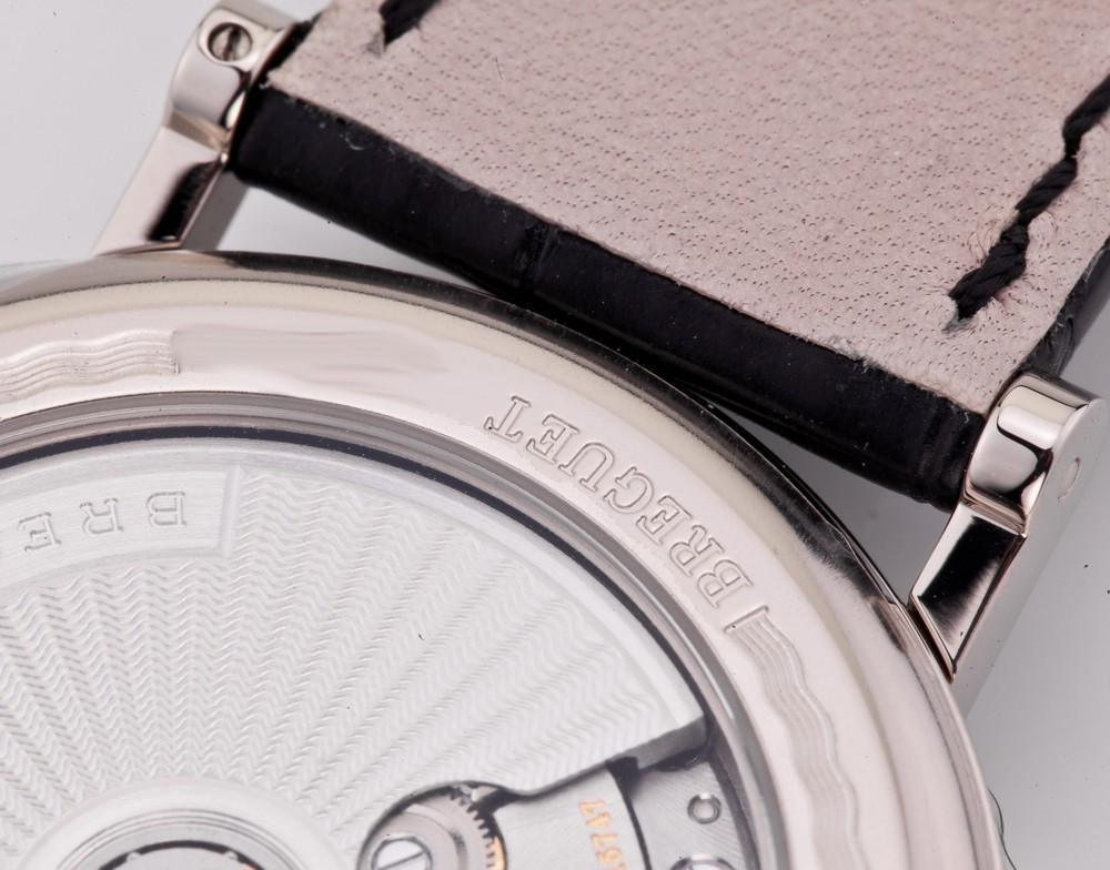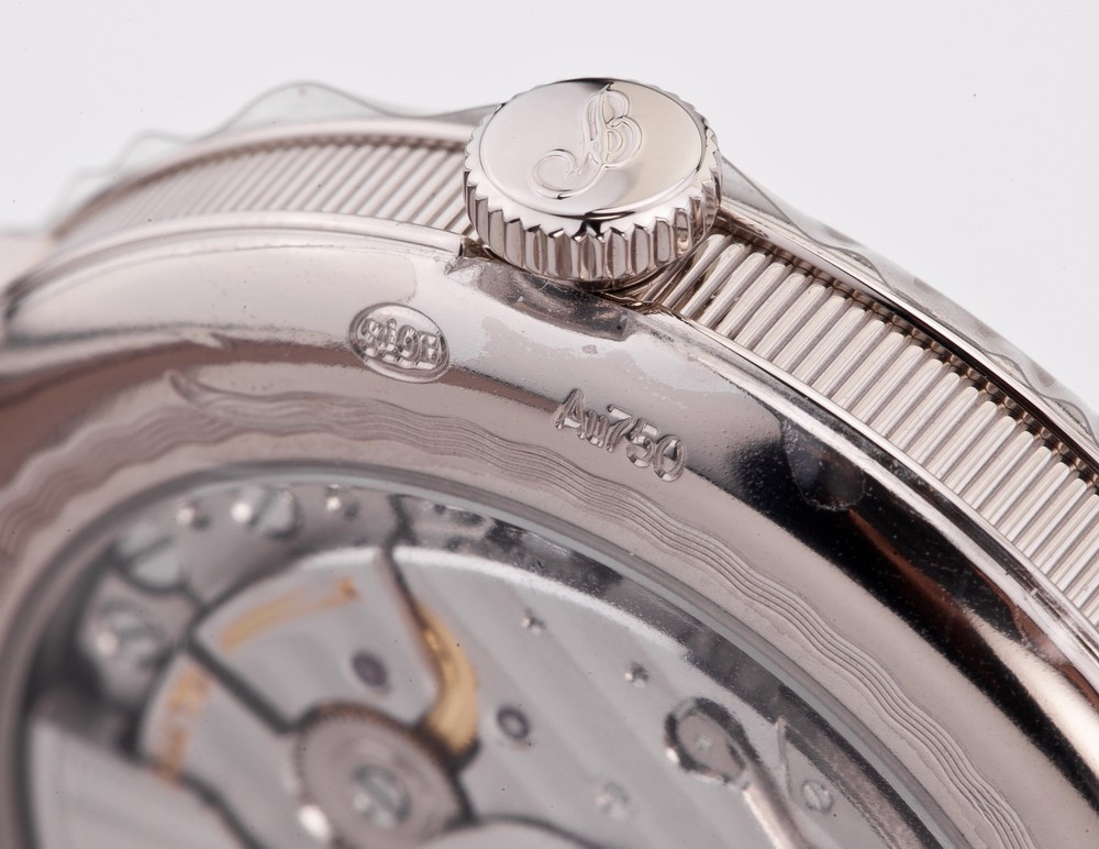 Часы Breguet изготовлены из белого золота 18к. Корпус размером 38 x 8.25 мм водонепроницаем до 30 метров. Внутри корпуса находится автоматический Калибр 240 с запасом хода 55 часов и функциями часов, минут, секунд и даты. Часовая, минутная и секундная стрелки расположены по центру белого эмалированного циферблата. На концах часовой и минутной стрелок из вороненой стали расположены яблоки Бреге. По внутреннему ранту нанесены арабские цифры. Апертура даты находится на 3-х часах. Швейцарские часы комплектуются черным ремешком из кожи аллигатора с застежкой из белого золота 18к.