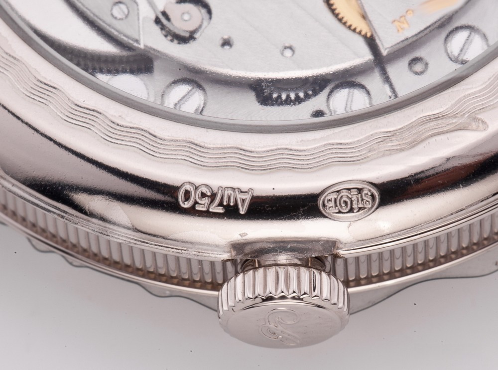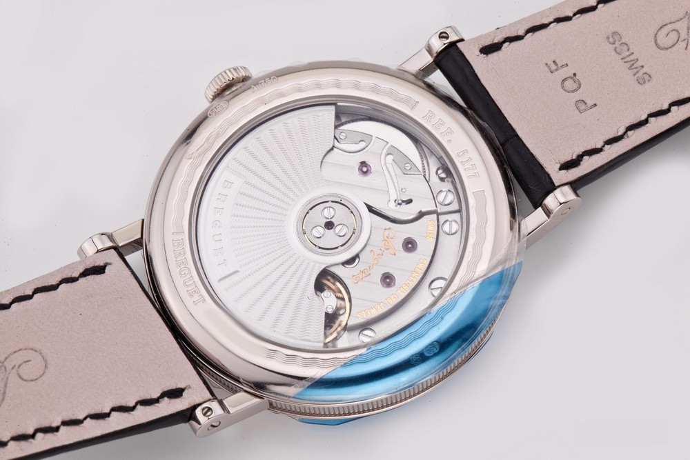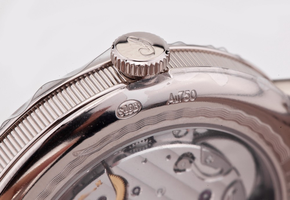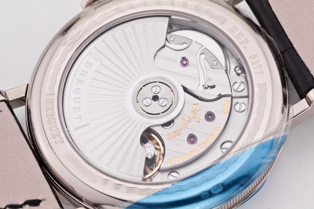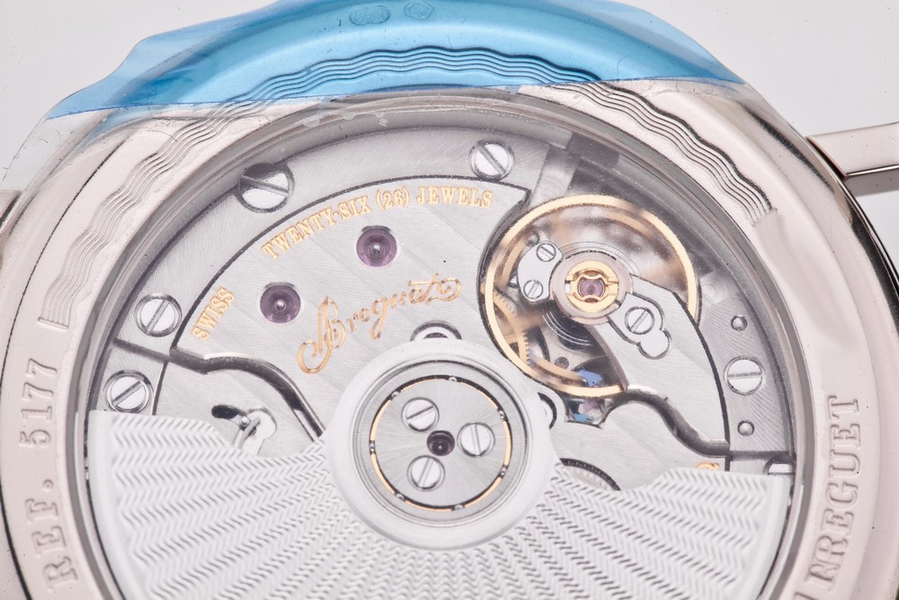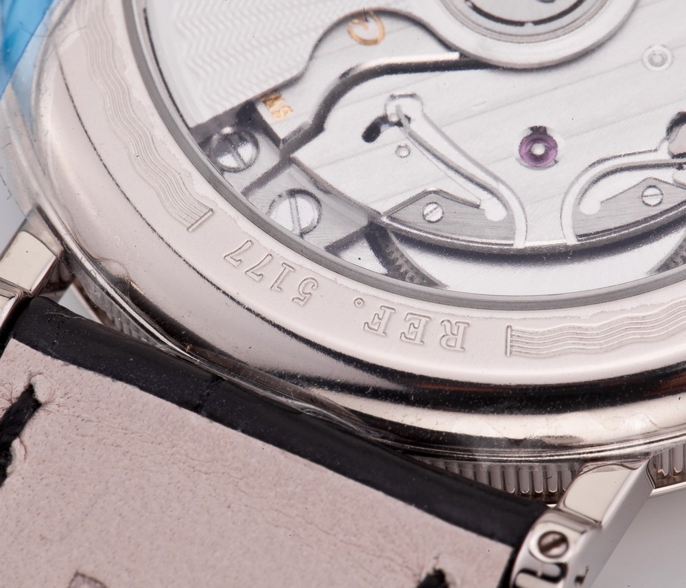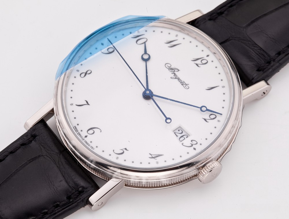 Часы Breguet изготовлены из белого золота 18к. Корпус размером 38 x 8.25 мм водонепроницаем до 30 метров. Внутри корпуса находится автоматический Калибр 240 с запасом хода 55 часов и функциями часов, минут, секунд и даты. Часовая, минутная и секундная стрелки расположены по центру белого эмалированного циферблата. На концах часовой и минутной стрелок из вороненой стали расположены яблоки Бреге. По внутреннему ранту нанесены арабские цифры. Апертура даты находится на 3-х часах. Швейцарские часы комплектуются черным ремешком из кожи аллигатора с застежкой из белого золота 18к.
