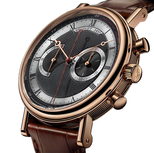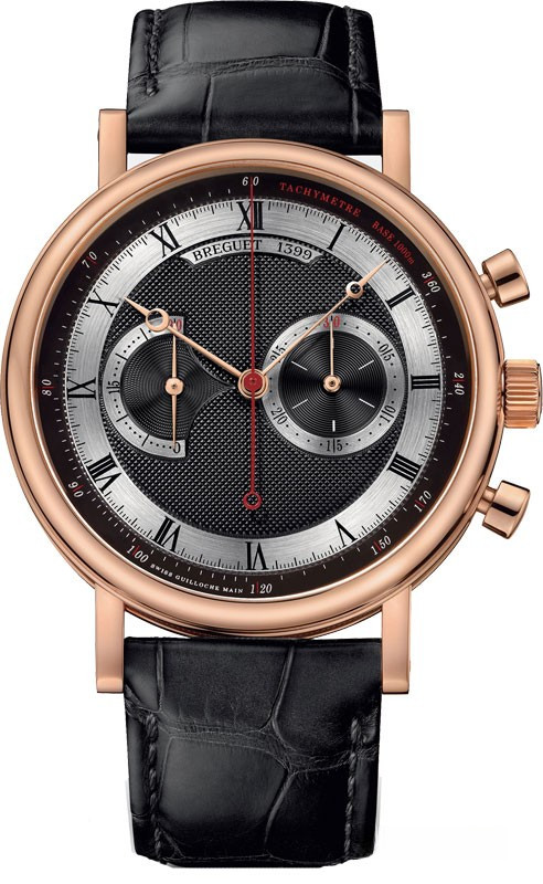 Хронограф в корпусе из розового золота 18к обладает размерами 42.5 х 12.1 мм и водонепроницаемостью до 30 метров. На серебристом с черным гильошированном циферблате расположены черные римские цифры, вороненые центральные стрелки, шкала тахиметра и накопители хронографа. Часы оснащены Калибром 533.3 с ручным заводом, запасом хода 48 часов и функциями часов, минут, секунд, тахиметра и хронографа. Боковая сторона круглого корпуса рифленая. С правой боковой стороны находится коронка часов и кнопки хронографа. Часы поставляются на коричневом ремешке из кожи аллигатора с золотой застежкой.