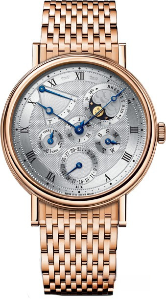 Часы Classique Grande Complication из 18-каратного розового золота. Ультратонкий автоматический механизм 502.3 DRP1 с ручной гравировкой, вечный календарь с индикацией дня недели, даты, месяца, года в високосном цикле, фаз луны и лунного цикла. Указатель запаса хода. Циферблат из посеребренного золота с гильошированным вручную узором. Секретная подпись. Задняя крышка из сапфирового стекла. Водонепроницаемые до 30 метров. Запас хода составляет 46 часов. Часы комплектуются браслетом из розового золота 18к.