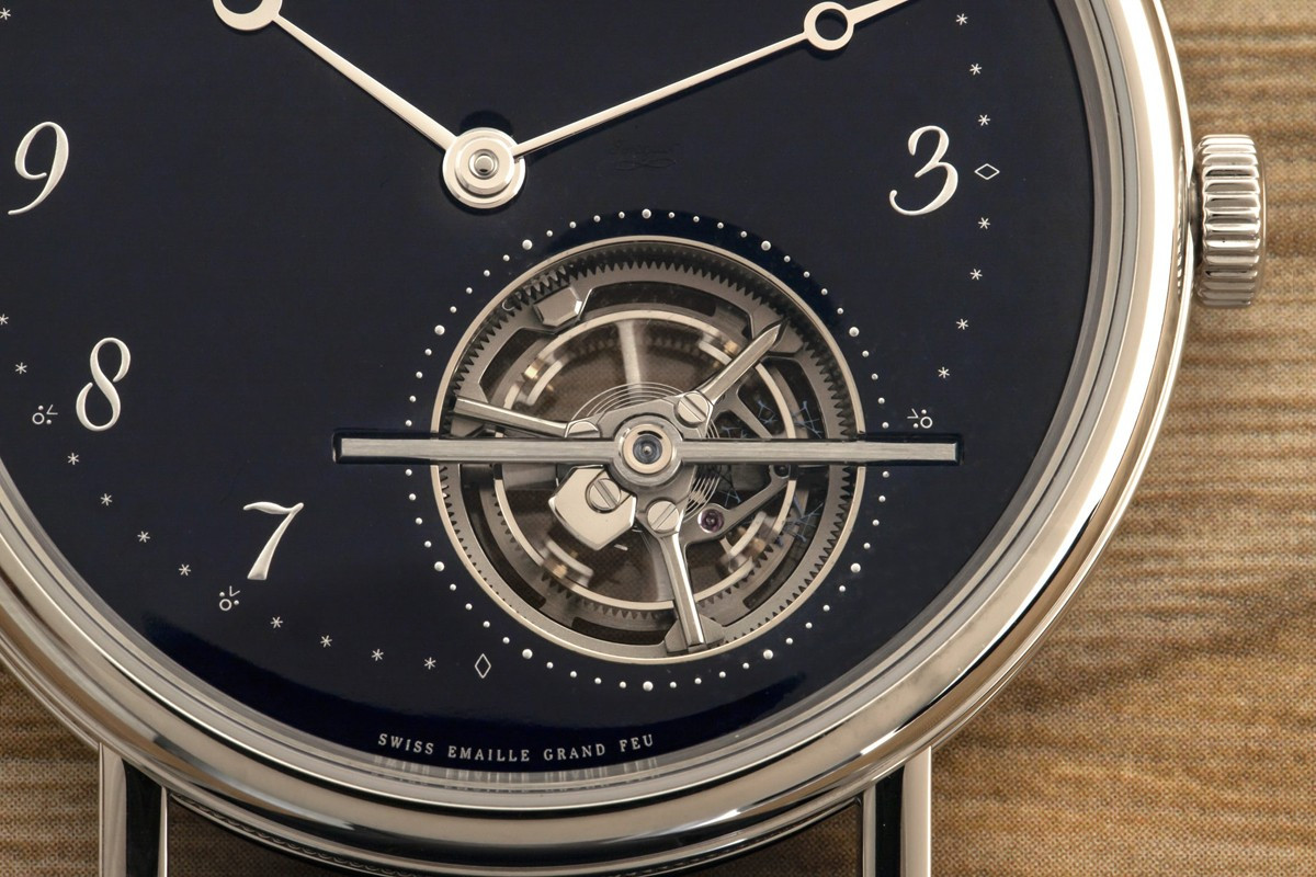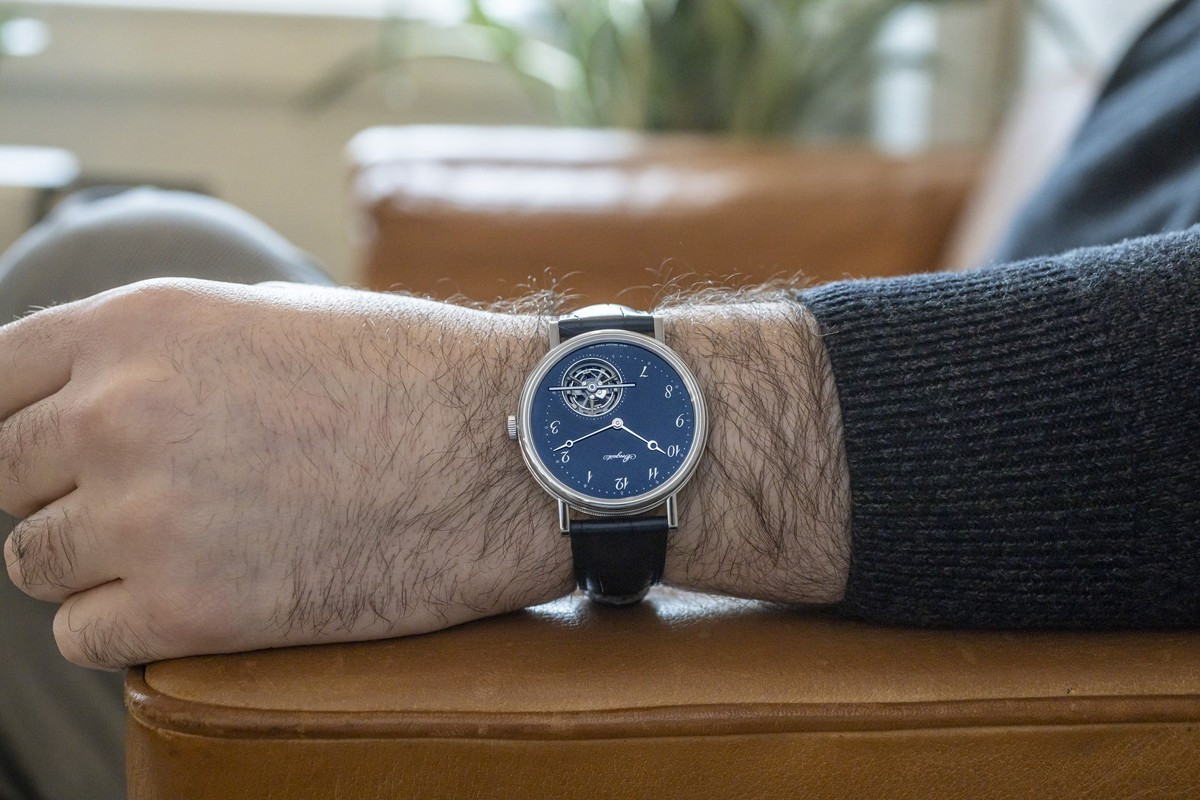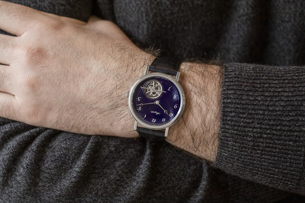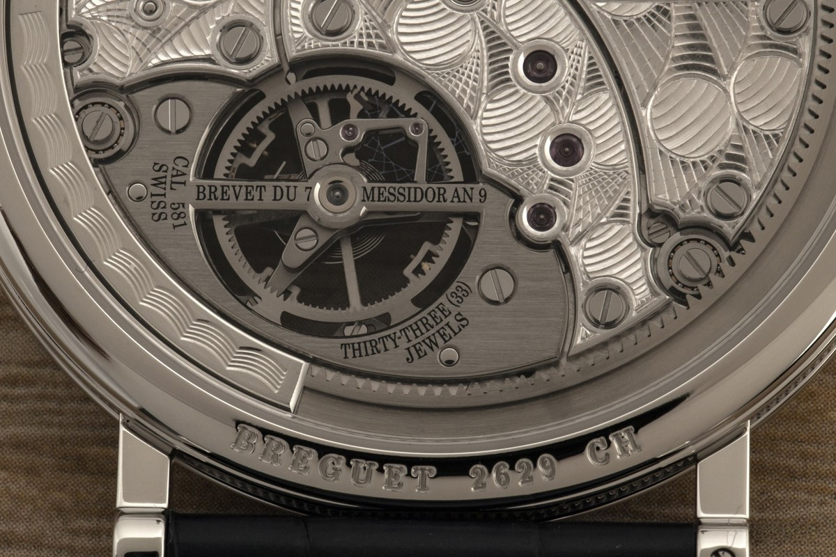 Часы Breguet 5367 представлены в корпусе из платины 950 размером 41 х 7.45 мм и водонепроницаемостью до 30 метров. Внутри корпуса установлен автоматический механизм, Калибр Breguet 581, с запасом хода 80 часов. На синем циферблате отображаются часы, минуты, секунды, клеть турбийона. Часы комплектуются ремешком из кожи аллигатора с вставкой из платины 950.