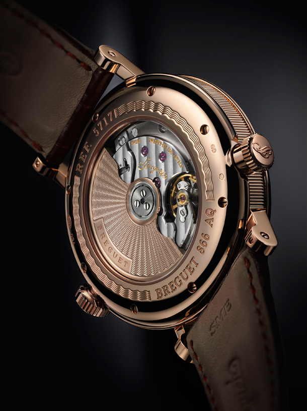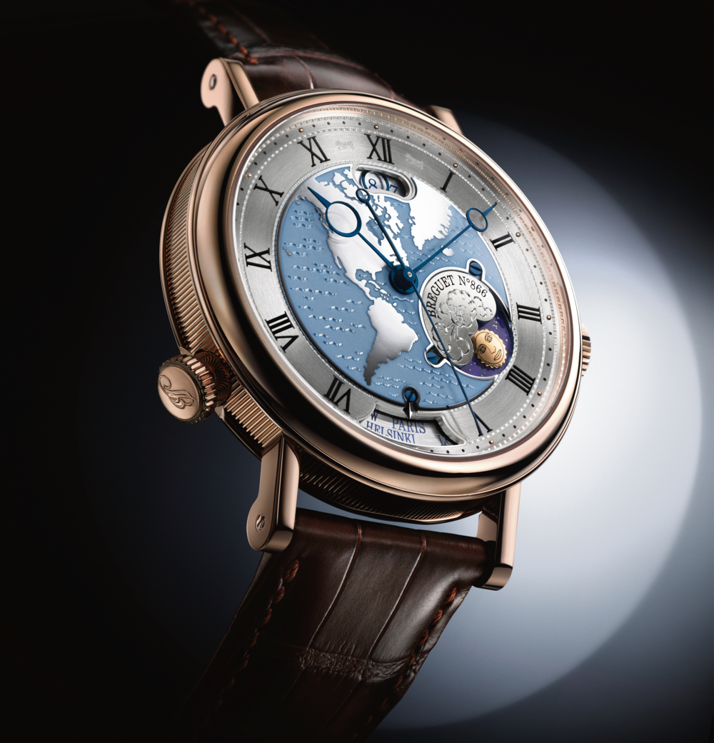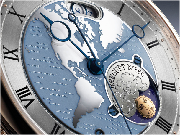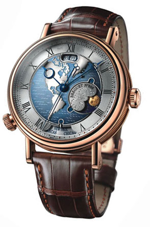Часы от Breguet под названием Classique 5717 Hora Mundi впервые были представлены в 2011 году на выставке Baselworld. Создание этой модели длилось более трех лет, и за это время компания разработала и зарегистрировала четыре патента – все для механизма новых часов. Главное техническое новшество, впервые реализованное в Classique 5717 Hora Mundi, – механизм мгновенного переключения часового пояса без нарушения хода часов. С помощью этой функции можно легко переключаться между двумя заранее выбранными часовыми поясами, переходя с одного на другой одним нажатием кнопки. Еще одна особенность часов – уникальная система отображения даты, реализованная с помощью вращающегося диска. Сам диск скрыт под циферблатом, виден только небольшой его фрагмент в окошке под отметкой 12 часов. В этой аккуратной апертуре отображаются три последовательные даты, которые медленно сменяют друг друга. Актуальное число выделено специальной стрелкой, которая сопровождает его в течение дня, а в полночь перескакивает на следующее число. То, что часы предназначены для путешественников, отображено и в их изысканном дизайне. Циферблаты всех моделей серии украшены изображением частей света: Европы, Америки, Африки, Азии, Океании. Географические мотивы в дизайне часов серии Hora Mundi – своеобразная дань памяти основателю бренда Абрахаму-Луи Бреге, который был страстным путешественником. Оригинально и стильно оформлен индикатор «день-ночь» с изображениями Луны и Солнца. Корпус часов изготовлен из розового золота 18 карат, ремешок – из кожи аллигатора с золотой застежкой. Часовой механизм – калибр 77F0 с автоматическим подзаводом, наполовину виден за прозрачной задней крышкой из сапфирового стекла.