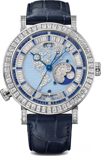 Часы Hora Mundi линии Classique из платины 950 пробы. Автоматический механизм. Индикация времени второго часового пояса с синхронизированным указанием даты, дня/ночи и города. Спираль, анкер анкерное колесо из кремния. Циферблат с изображением контуров Америки, с выполненным вручную гильошированным узором «волны» и покрытием из прозрачного лака украшен 154 бриллиантами (около 0,399 карата). Часовая шкала украшена 76 бриллиантами огранки «багет» (около 2,01 карата) и 83 сапфирами огранки «багет» (около 1,98 карата). Безель, корпусное кольцо и «ножки» украшены 130 бриллиантами огранки «багет» (около 17,32 карата). Задняя крышка из сапфирового стекла. Водонепроницаемые до 3 бар (30 м). Диаметр: 46 мм.