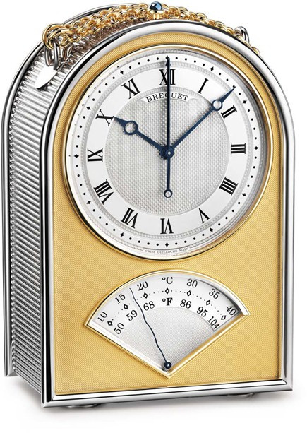Дорожные часы Classique из серебра, снабженные термометром со шкалой Цельсия и Фаренгейта. Механизм хронографа с ручным заводом, Калибр 564/1. Суммирующий счетчик минут и секунд в центре. Циферблат из серебра 925 пробы с гильошированным вручную узором. Размеры корпуса 55 х 133 х 91 мм. Запас хода составляет 192 часа.