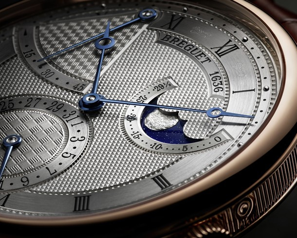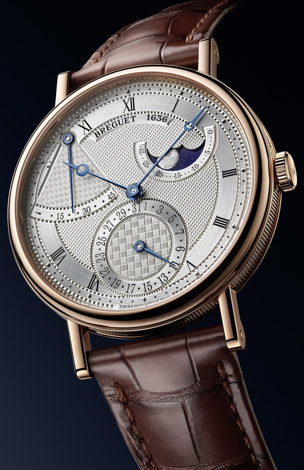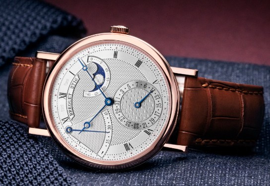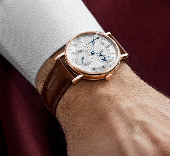 Часы Classique из 18-каратного розового золота укомплектованы автоматическим механизмом. Циферблат серебристый с гильошированным вручную узором. Указатель лунного цикла и фаз луны в положении "2 часа". Указатель даты в положении "6 часов". Указатель запаса хода в положении "10 часов 30 минут". Запас хода 45 часов. Задняя крышка из сапфирового стекла. Размеры корпуса - 39 х 8.65 мм, водонепроницаемость до 30 метров. Часы поставляются на ремешке из кожи аллигатора с вставкой из розового золота 18к.