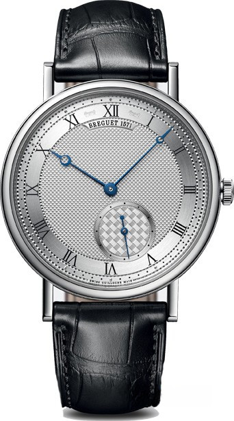 Корпус часового механизма из 18-каратного белого золота с изящно рифленым корпусным кольцом. Задняя крышка из сапфирового стекла. Диаметр 40 мм. Припаянные «ушки» с винтовыми планками. Водонепроницаемость до 3 бар (30 м). Циферблат серебристый гильошированный. Надпись Breguet. Часовая шкала представлена римскими цифрами Breguet. Малая секундная стрелка смещена к положению «5 часов». Стрелки Breguet с открытым наконечником из вороненой стали. Механизм с автоподзаводом, калибр 502.3SD. Номер и надпись Breguet Экстра-тонкие (2,4 мм). 12 линий. 35 камней. Запас хода 45 часов. Перевернутый однорядный анкерный спуск с кремниевыми паллетами. Кремниевая спираль. Частота колебаний балансира составляет 3 Гц. Механизм отрегулирован в 6 положениях. Ремешок из крокодиловой кожи с золотой пряжкой.