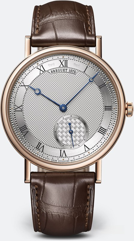 Корпус часов изготовлен из 18-каратного розового золота с тонко рифленой боковой поверхностью. Задняя крышка из прозрачного сапфирового стекла. Диаметр корпуса 40 мм, водонепроницаемость до 3 бар (30 м). Циферблат из посеребренного 18-каратного золота. Часы индивидуально пронумерованы и подписаны Breguet. На циферблате расположены римские цифры. Часы и минуты отображаются при помощи центральных стрелок из вороненой стали с яблоками Breguet, малая секундная стрелка находится на 5-ти часах. Часы комплектуются автоматическим механизмом 502.3SD с запасом хода 45 часов. Поставлется на ремешке из кожи аллигатора с золотой застежкой.