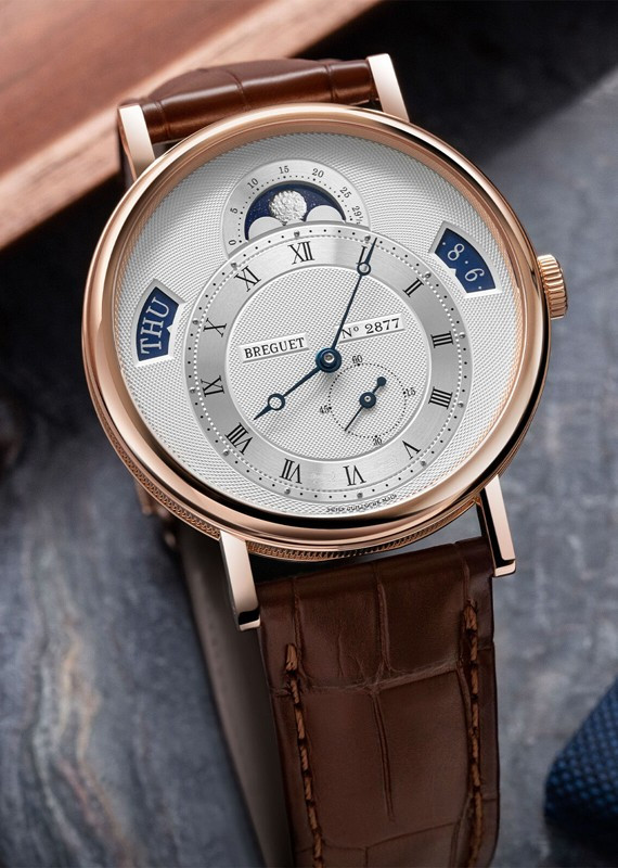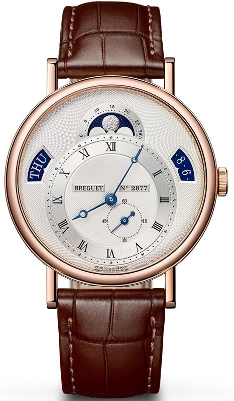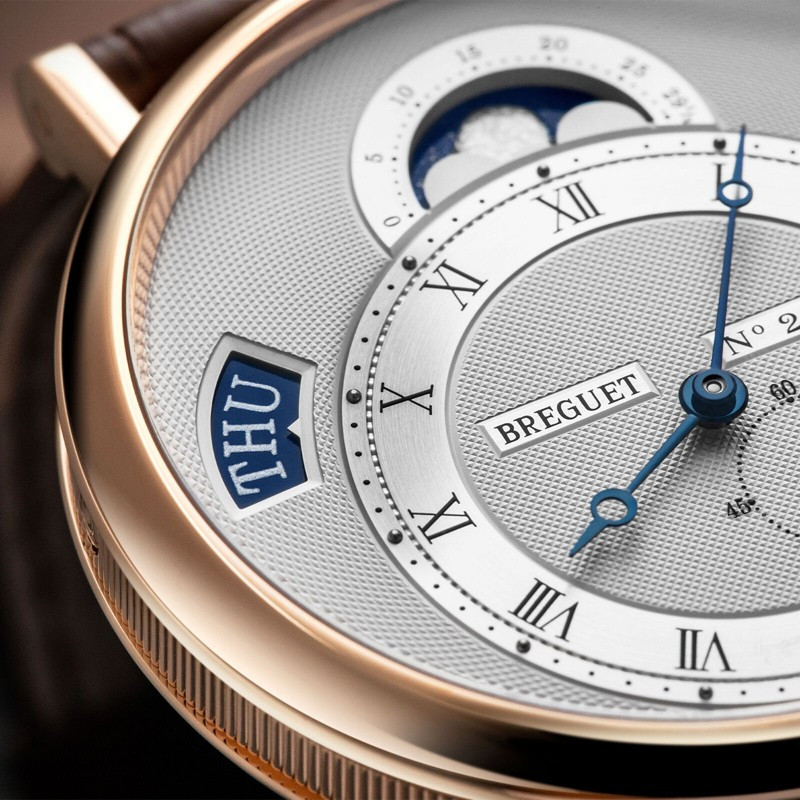Часы линии Classique изготовлены из 18-каратного розового золота. Автоматический механизм с малой секундной стрелкой. Индикация дня недели, даты, фаз Луны и лунного цикла. Спираль и анкер из кремния. Смещенная часовая шкала. Циферблат серебристого цвета. Задняя крышка из сапфирового стекла. Водонепроницаемые до 30 м. Диаметр: 39 мм. Часы комплектуются ремешком из кожи аллигатора с застежкой из розового золота 18к.