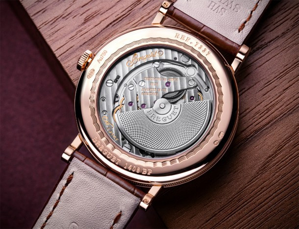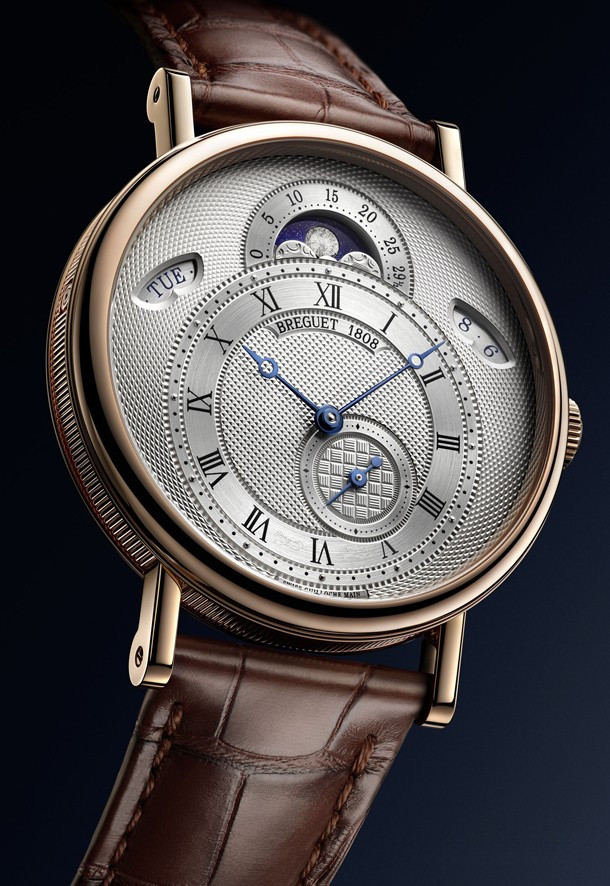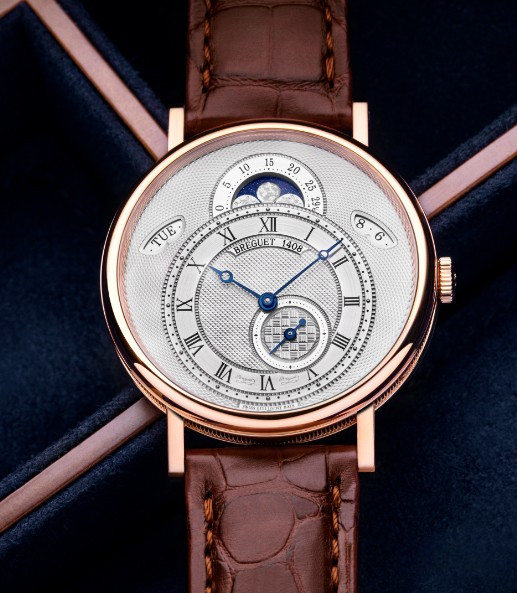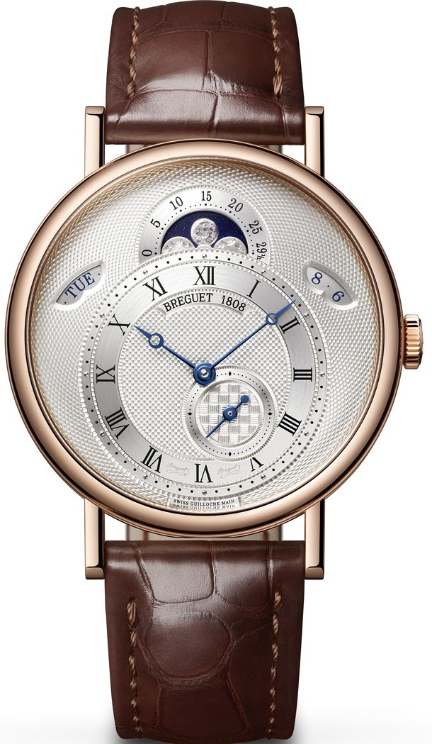 Часы линии Classique изготовлены из 18-каратного розового золота. Автоматический механизм с малой секундной стрелкой. Индикация дня недели, даты, фаз Луны и лунного цикла. Спираль и анкер из кремния. Смещенная часовая шкала. Циферблат серебристого цвета. Задняя крышка из сапфирового стекла. Водонепроницаемые до 30 м. Диаметр: 39 мм. Часы комплектуются ремешком из кожи аллигатора с вставкой из розового золота 18к.