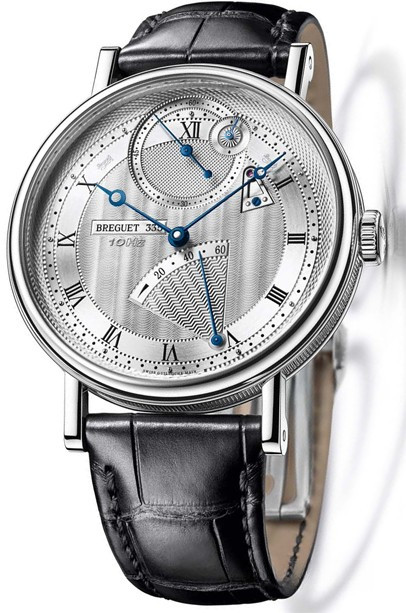 Классический хронометр Breguet Chronometrie 7727 из коллекции Grand Complications в корпусе из 18-каратного белого золота работает с частотой колебаний 10 Гц. В часах Breguet столь высокая частота не уменьшает запас хода. Он составляет 60 часов.Индикатор запаса хода на позиции 5 часов. Циферблат красиво украшен — он гильоширован с использованием шести разных шаблонов. В центре узор «Женевские волны», узор «Clou de Paris» украшает маленький секундный циферблат, счетчик десятых долей секунды гравирован с использованием шаблона «Солнечные лучи», а индикатор запаса хода украшен узором «Шеврон». Обрамление часовой шкалы выполнено с использованием шаблона «Ячменное зерно». Классический ремень из кожи аллигатора подчеркивает изысканность модели. Эти часы оснащены калибром 574 DR. Механизм с ручным заводом. Магнитный баланс Breguet на кремниевой спирали колеблется с частотой 10 Гц. Прямолинейный швейцарский анкерный спуск также из кремния. Крышка корпуса из сапфирового стекла и позволяет видеть механизм. Водонепроницаемые до 30 метров / 100 футов.