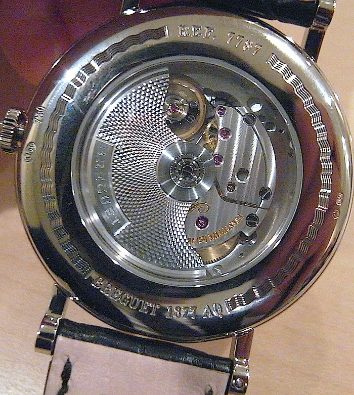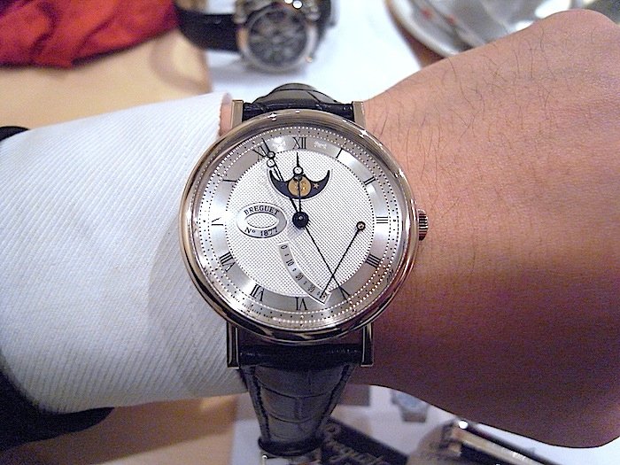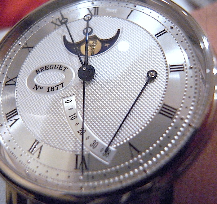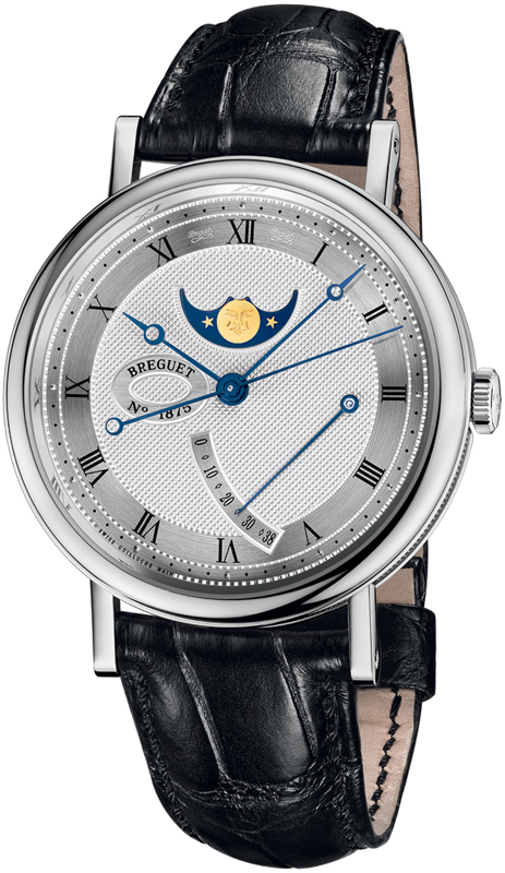 Часы Classique в корпусе из 18-каратного белого золота диаметром 39 мм с указателем фаз луны. Автоматический механизм, Калибр 591 DRL. Циферблат из посеребренного 18-каратного золота с гильошированным вручную узором. Шкала с римскими цифрами. Указатель фаз луны и лунного цикла в положении "12 часов". Указатель запаса хода в положении "3 часа". Стрелки Breguet с наконечником в форме яблока из вороненой стали. Водонепроницаемость корпуса до 30 метров. Часы комплектуются черным ремешком из кожи аллигатора с застежкой из белого золота 18к.
