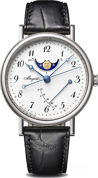 Часы Classique в корпусе из 18-каратного белого золота диаметром 39 мм с указателем фаз луны. Автоматический механизм, Калибр 591 DRL. Циферблат белый. Шкала с арабскими цифрами. Указатель фаз луны и лунного цикла в положении "12 часов". Указатель запаса хода в положении "3 часа". Стрелки Breguet с наконечником в форме яблока из вороненой стали. Водонепроницаемость корпуса до 30 метров. Часы комплектуются черным ремешком из кожи аллигатора с застежкой из белого золота 18к.