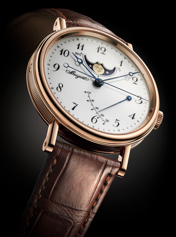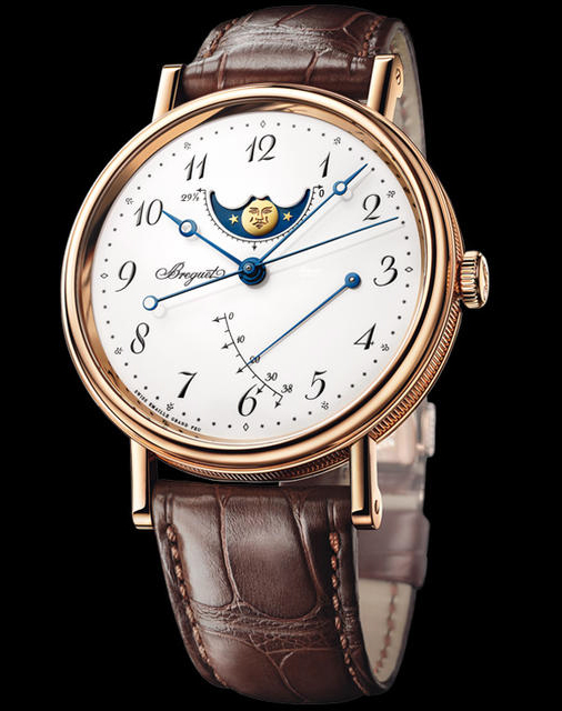 Классические часы в корпусе из 18-каратного розового золота. Циферблат с отделкой из эмали в технике "горячая эмаль". Часовая шкала с арабскими цифрами Breguet. Указатель фаз луны и лунного цикла в положении "12 часов". Указатель запаса хода в положении "3 часа". Стрелки Breguet с наконечником в форме яблока из вороненой стали. Внутрь корпуса заключен автоматический Калибр 591 DRL с запасом хода 38 часов. Водонепроницаемость корпуса составляет 30 метров. Часы комплектуются коричневым ремешком из кожи аллигатора с застежкой из розового золота 18к.