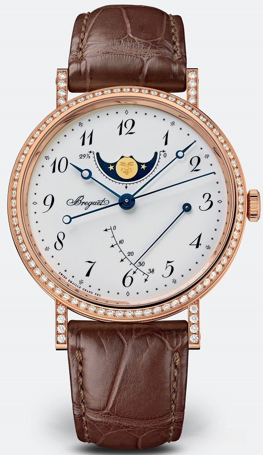 Часы Breguet Classique 7788BR/29/9V6 DD00 представленыв корпусе из розового золота 18к размером 39 x 10.2 мм и водонепроницаемостью 30 метров. Корпус инкрустирован белыми бриллиантами. Часы комплектуются автоматическим механизмом, Калибр 591 DRL с запасом хода 38 часов. На белом эмалированном циферблате 'Grand Feu' отображаются часы, минуты, секунды, запас хода, фаза луны. Поставляется модель на коричневом ремешке из кожи аллигатора с застежкой из розового золота 18к.